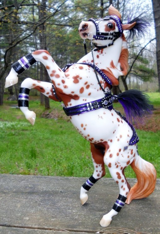 North American Nationals (NAN) NAN 2014 Auction Lot 8: LSQ Traditional Size Circus Ring Costume and LSQ OOAK custom etched leopard Appaloosa Breyer Silver created by Lindy Pinkham - Rainbow's End Saddlery (a division of Sunny Shamrock Farm). A sure show stopper in the show ring! Breyer Traditional Silver mold custom etched to gorgeous leopard Appaloosa by Lindy Pinkham. Spectacular color! Sure to catch the judges eye! Brand new and unshown! He sports a gorgeous wildly spotted coat with lots of roaning, halo-ed spots & ghost spots, glossy life-like eyes Realistic and correct hair coat pattern. Four hand etched and painted correct hooves. Thousands of etch strokes and months of work went into creating this lovely guy! He's wearing his custom made OOAK Circus Tack. Made of quality leathers, Rio Rondo hard wear, silver diamond accents and studs. Features real Swarovski crystals for all the bling you need to catch the judges eye! Come with real feather plumes that detach form the bridle and saddle for easy transport and storage. Correct in every way! Comes with Lindy's full guarantee for repair or replacement for the life time of the original owner. LSQ all the way! Ready to win for you! Newly created for the NAN auction. Many of her etched creations and tack have won Championships for their new owners! Lindy has been creating custom etched champions and tack since 1990, taught etching and tack making workshops at Breyerfest 2002, 2004 2005,2006 and 2007, 2008 and wrote an article on etching and a series of tack making articles for Just About Horses. Donated by: Lindy Pinkham of Shamrock Farm / Rainbow's End Saddlery https://groups.yahoo.com/neo/groups/SSF-RBESgroup/info 50% Donation Reserve Met ![]() | |