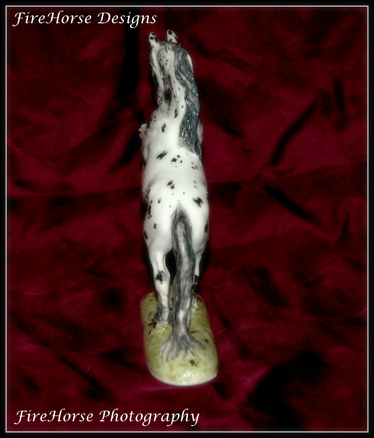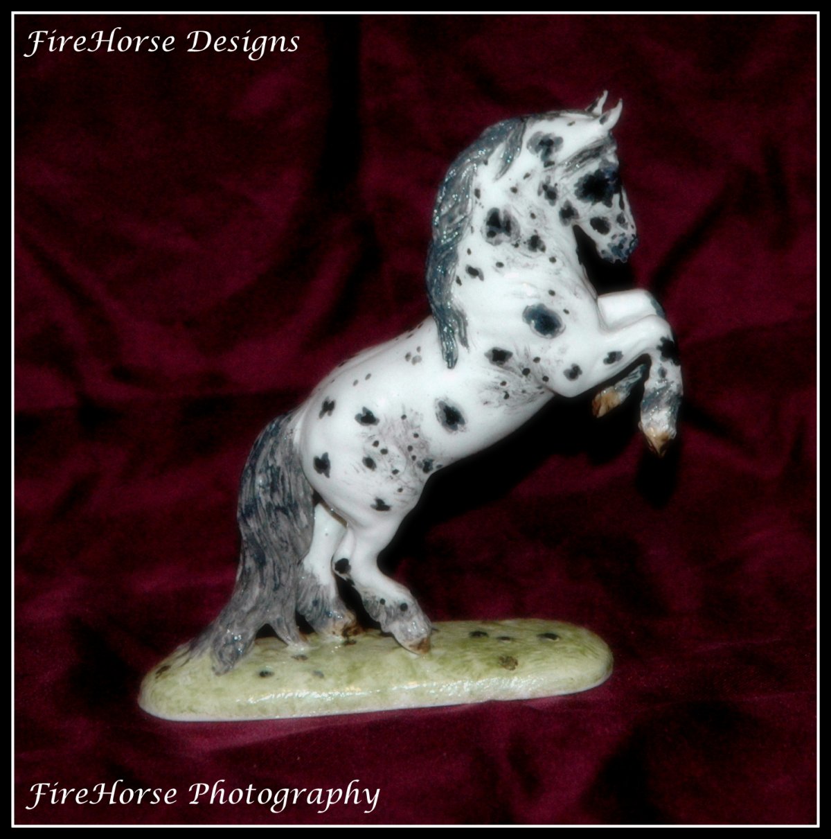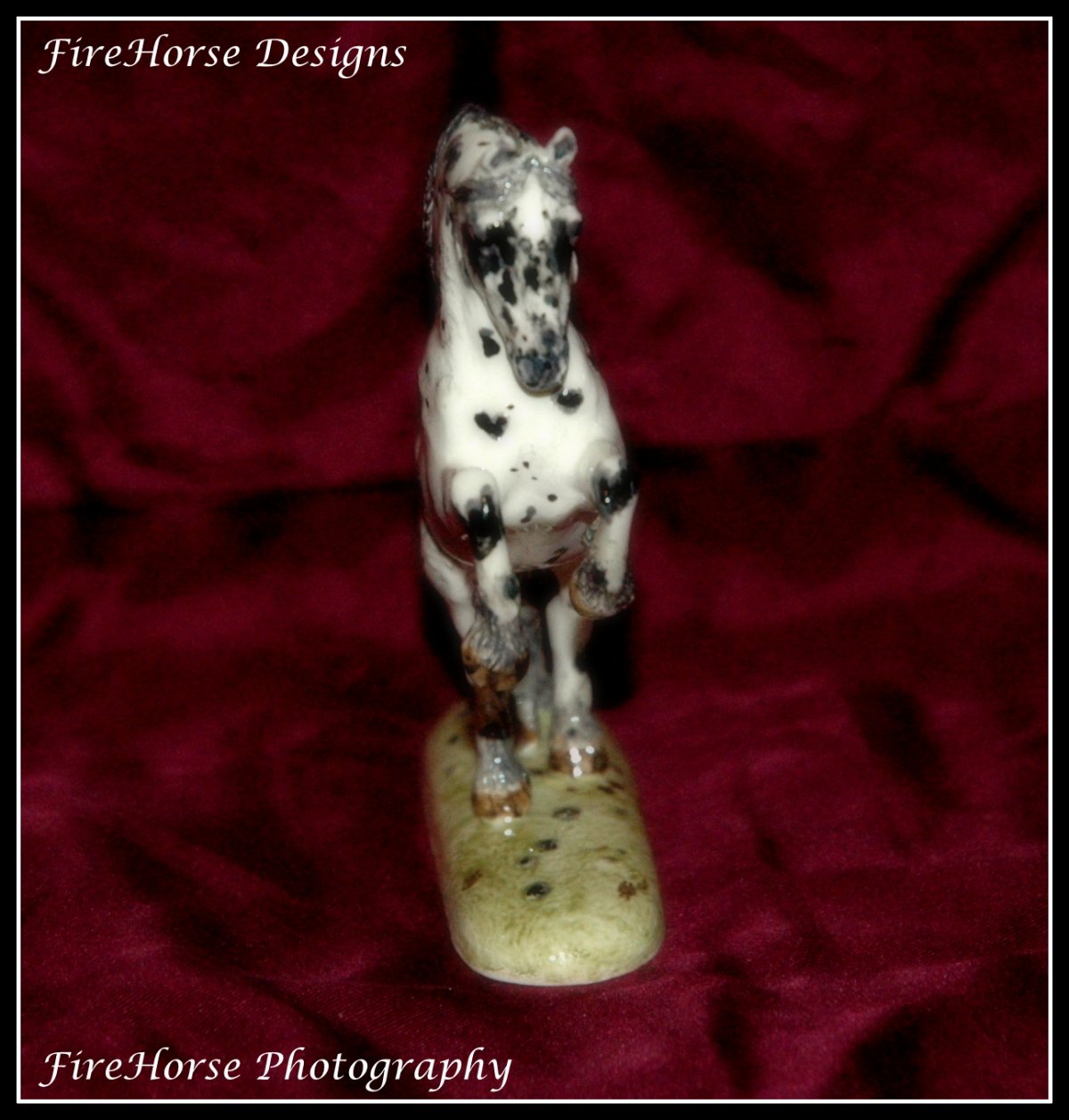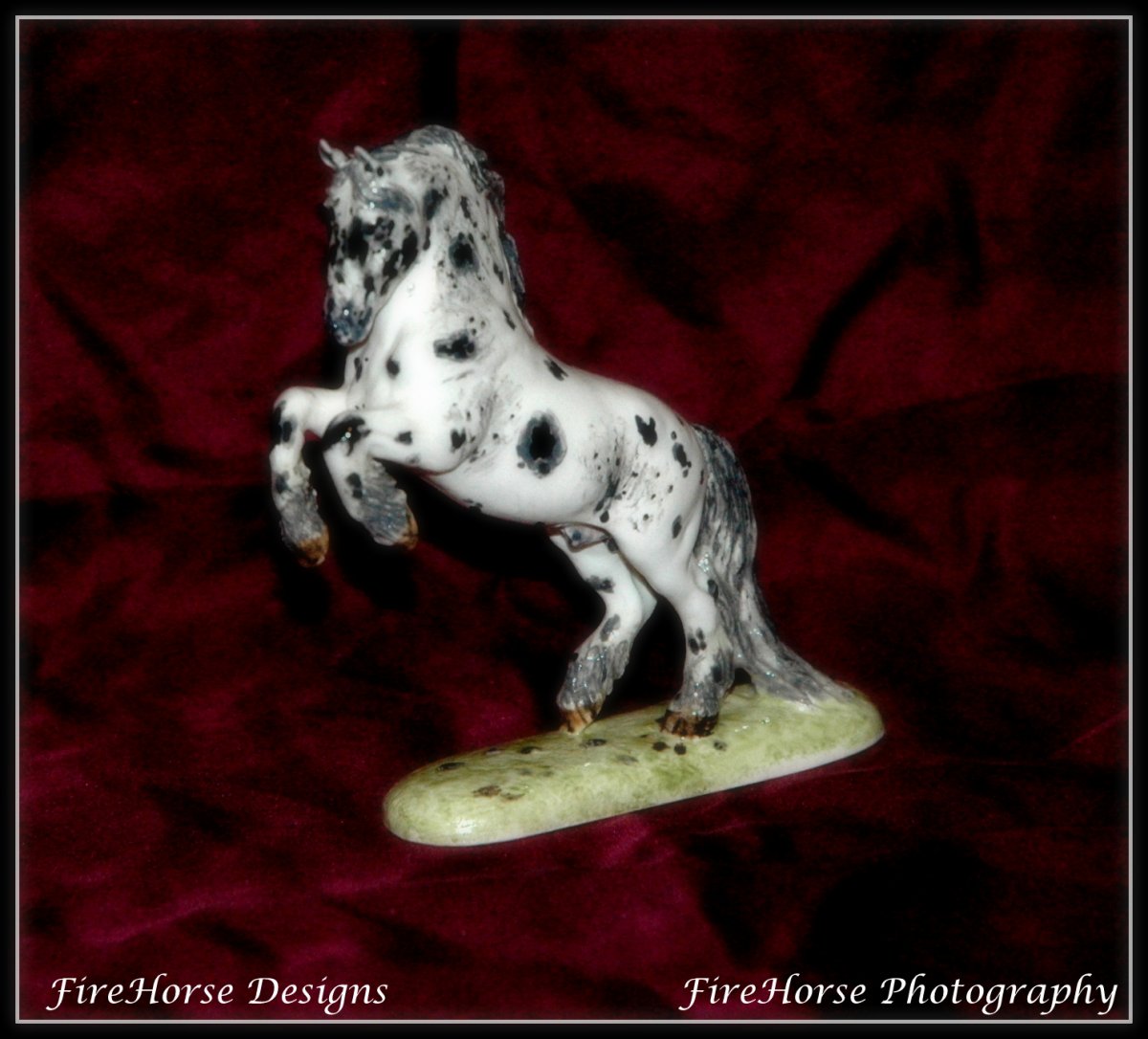 North American Nationals (NAN) NAN 2014 Auction Lot 9: AA Chaney earthenware china in the rearing Shire stallion mold, done to a b/w leopard Sugarbush drafter. Glazed with high gloss Mayco leaded clear glaze then china painted in multiple layers, with multiple firings, to a black and white leopard appaloosa pattern. Has tricolored eyes with sclera, stripped hooves, mottling around eyes, muzzle, and sheath, haloed spots and haired brushwork, etc. His stand has been finished in china paint as a grassy field. Decal has been fired onto the bottom of the stand with the artist's name and studio. Cheryl Farrens of FireHorse Designs has had many pieces place in the top ten at NAN in CM, AR, and CG divisions. Her work has garnered division championships, national ceramic awards, and championships in juried art shows. This piece is new and unshown. Donated by: Cheryl Farrens of FireHorse Designs www.firehorsedesigns.org 50% Donation Reserve Met