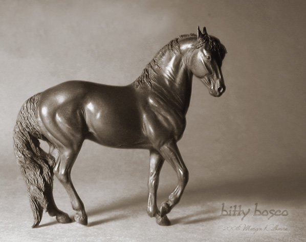 Morgen has donated an unpainted Bitty Bosco, a 3.2 inches tall large stablemate (~1:32) scale Kiger mustang stallion. This resin was an open edition for a year, and is now sold out. He is a digitally reproduced "derivative" sculpture in mirror image of the original sculpture "El Embosco" done by Morgen Kilbourn. This was produced by lazer scanning a modified original traditional "Bosco" resin, digitally "flipped" to create the mirror image and then was reproduced at 3.2 inches tall. The "bitty" resins are solid cast. ![]() | |||
