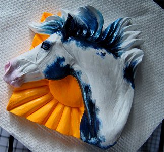 This Sarah Minkiewicz-Breunig medallion is base coated in metallic teal and the coat is applied one wee hair at a time with tiny brushes. I use auto paint as base coats and hand detail everything else in acrylics. Shown in progress. ![]() | |||
