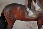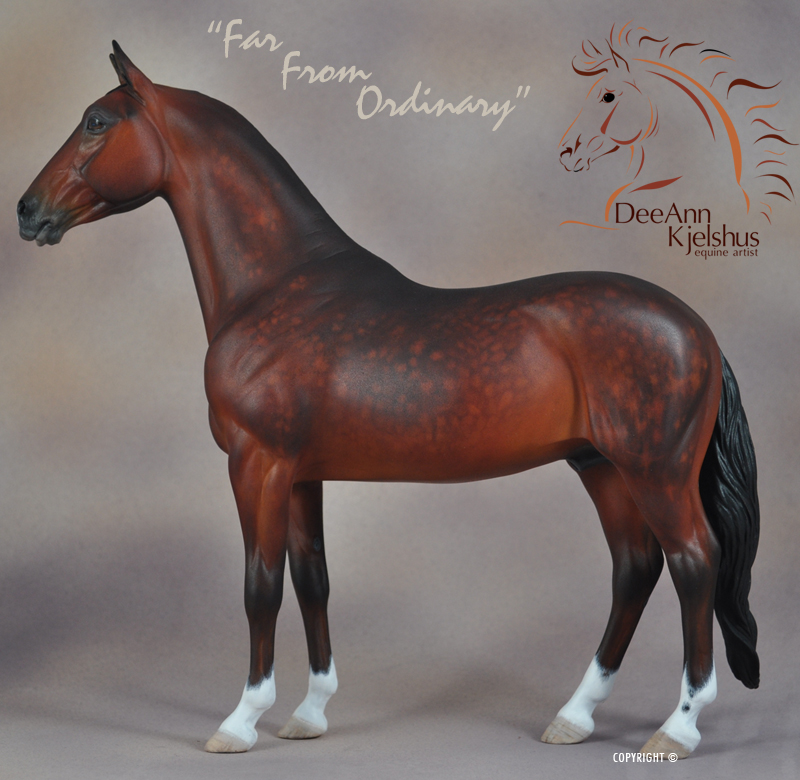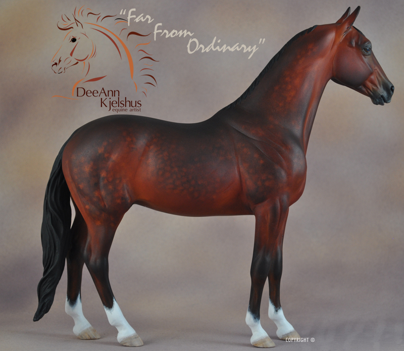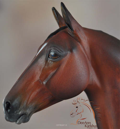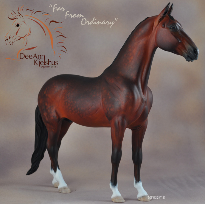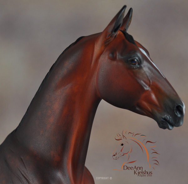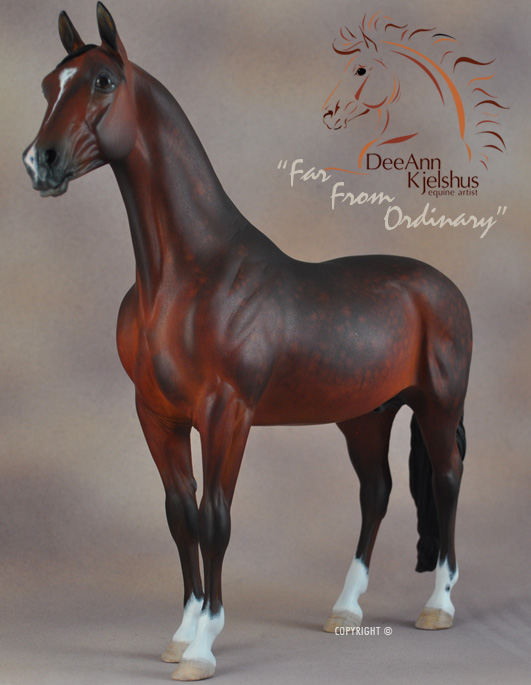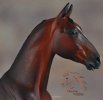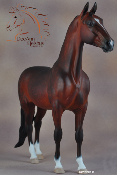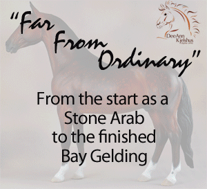 Drastic Custom Stone Arab into a Sport horse Gelding. Hindquarters and hind legs removed, legs reattached correctly for breed standards. Brand new, all original head, neck and hindquarters and tail. Entire custom is about 85% original. Painted Bay in Acrylics, Pastels, Inks and colored pencils. View the process from start to finish on DeeAnn's website or in the animation below. ![]()