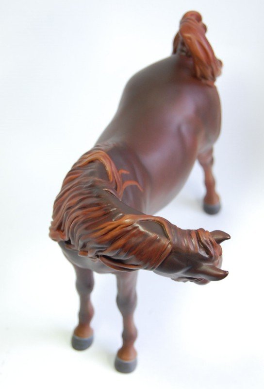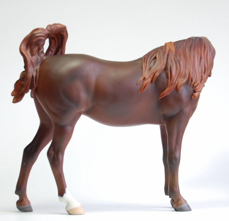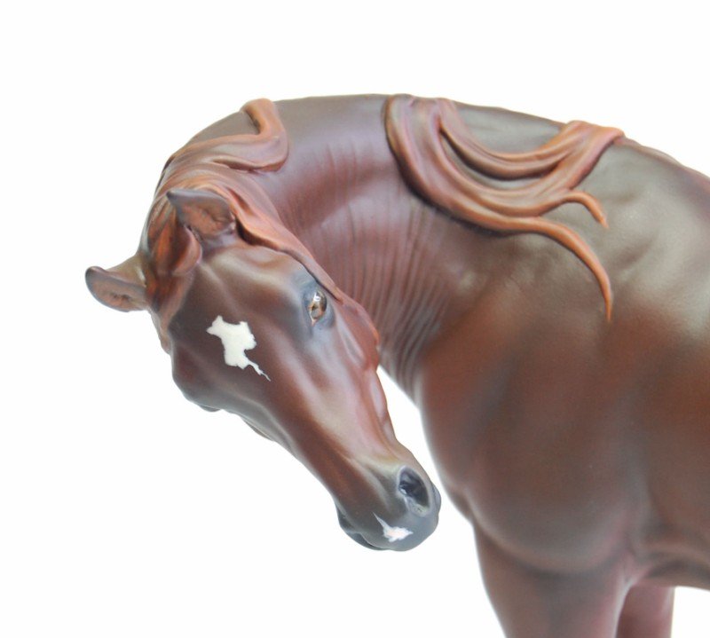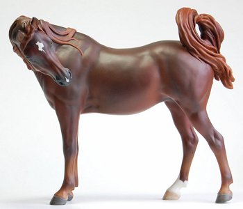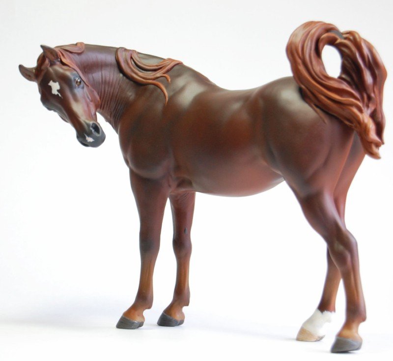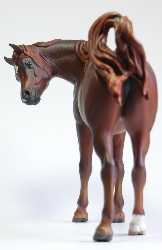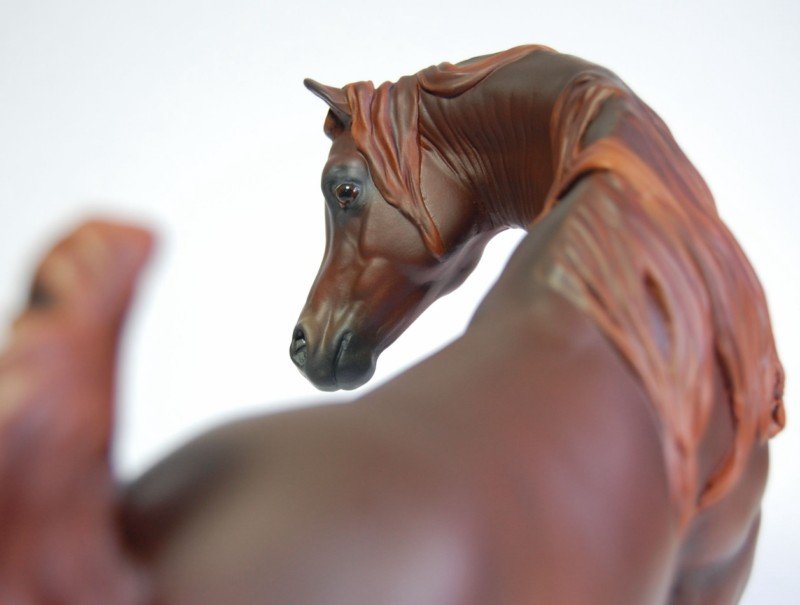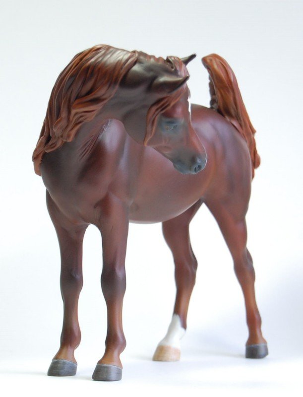 "Zalika" is a customized Breyer Proud Arabian Mare. I wanted to preserve the gentle face and lovely sculpting of this model while making her just a little different. To that end, I've moved her head so she looks to her side, flipping her tail up. I've resculpted her neck and also narrowed her entire body, giving her a more delicate appearance. Areas that were lacking in definition have been resculpted and defined as well. I then painted her a rich liver chestnut.
