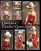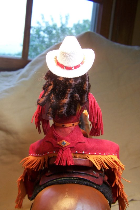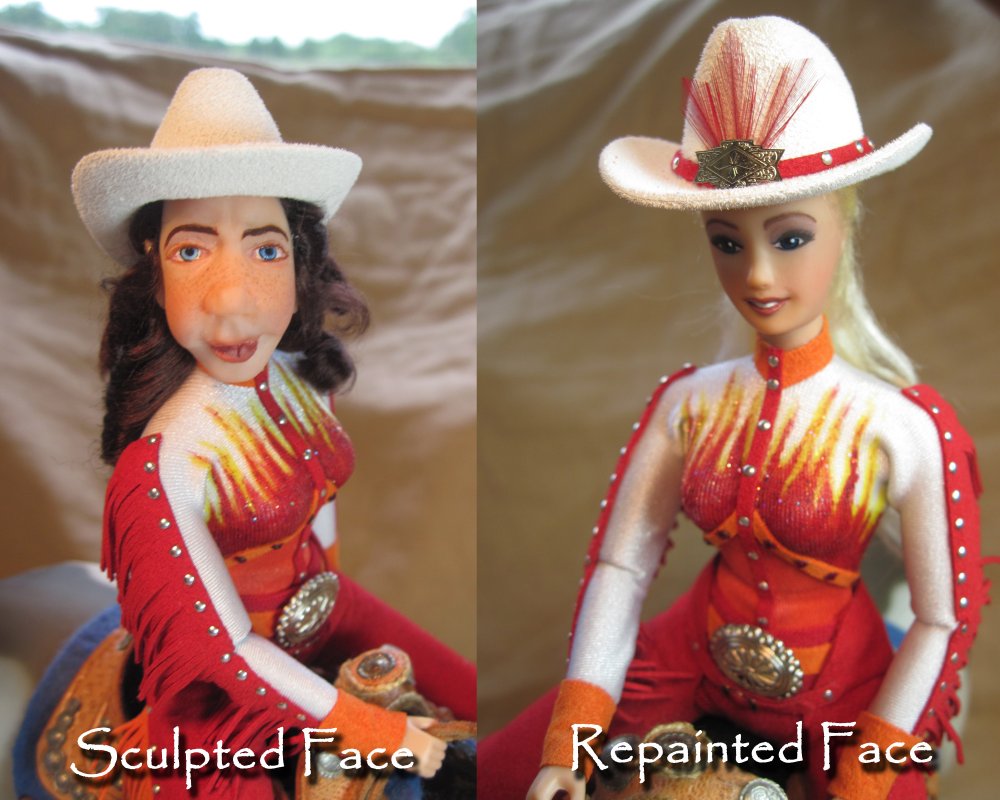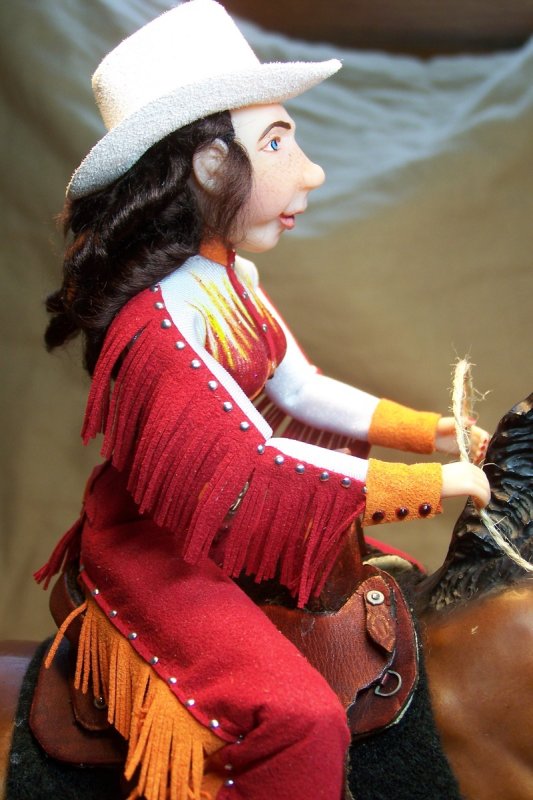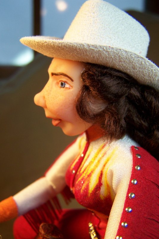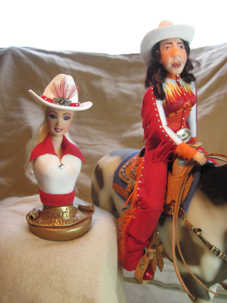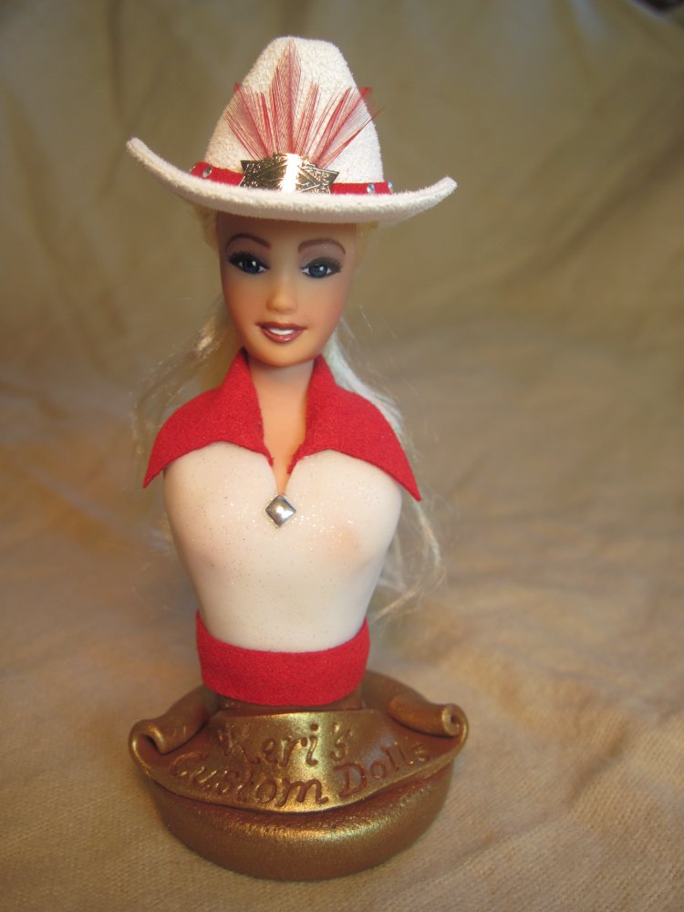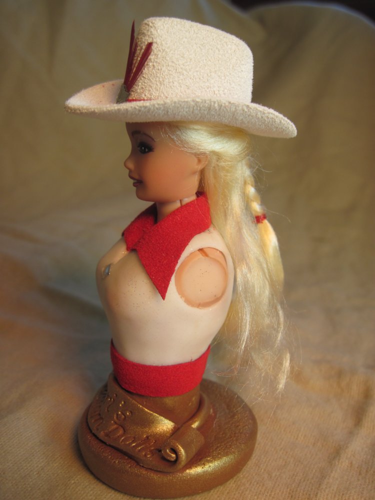Since the doll's heads are held on with magnets, Keri decided to include two heads that could be swapped on the same doll body. One head is a "factory" head that has been repainted and re-haired with blonde viscose. She is a "pretty" girl that could be used as a rodeo queen or parade doll. The second head is one that the artist has hand sculpted from polymer clay and painted. She has a look of determination on her face. She has dark brown viscose hair that has been curled. Each head has its own western hat. The heads are interchangeable giving the owner more options on how they could use the doll. Keri has also created a base that would hold whichever head isn't in use.