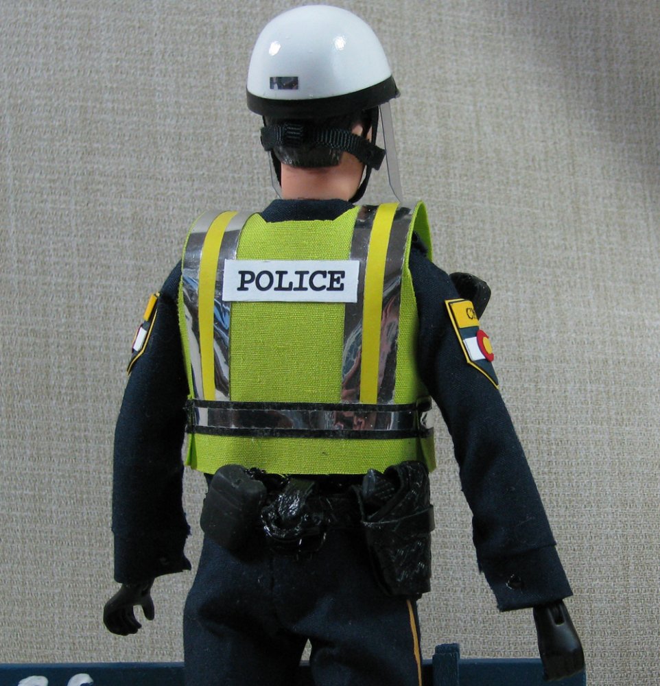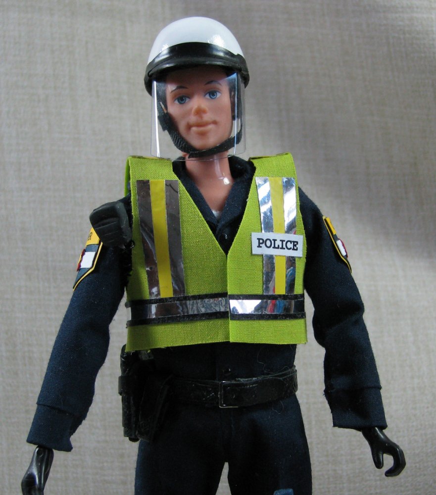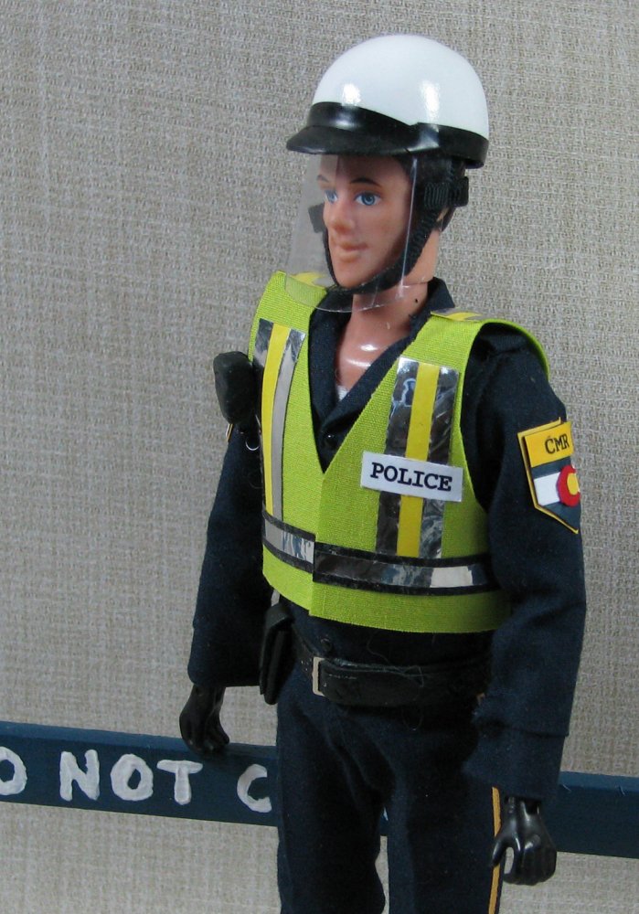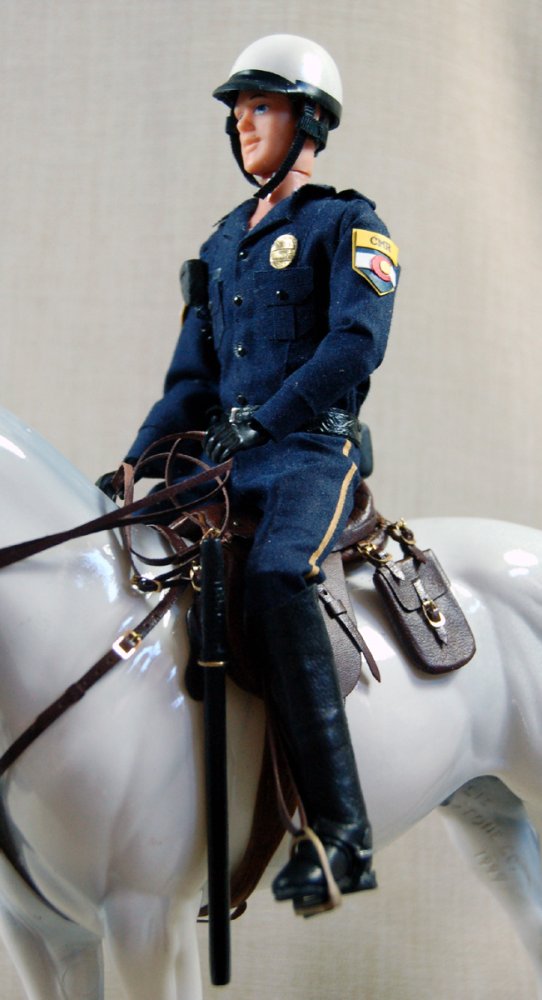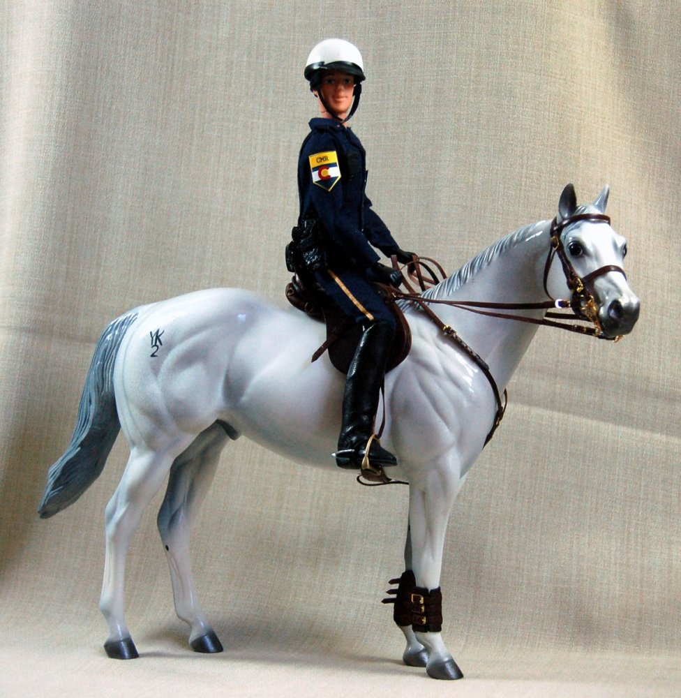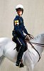 The doll in this auction lot is by Jane Schneider of Glyn Haven Studios. Jane has taken a Breyer doll and turned him into Officer Joe, a handsome mounted policeman. His seat and legs have been modified to fit nicely in the saddle. He is wearing a uniform of navy blue that is complete with badge and shoulder patches. He has his walkie and wears a leather belt with holster and removable sidearm, handcuffs, ammo clips and pepper spray. He has heavy field boots with spurs and a white riding helmet. In addition to his everyday patrol gear, Joe comes with extra gear for those hard-to-control crowds: a high visibility police vest, a second helmet with safety shield and knee protectors. Jane's books are closed, so this is your chance to get a doll that would not be available otherwise.