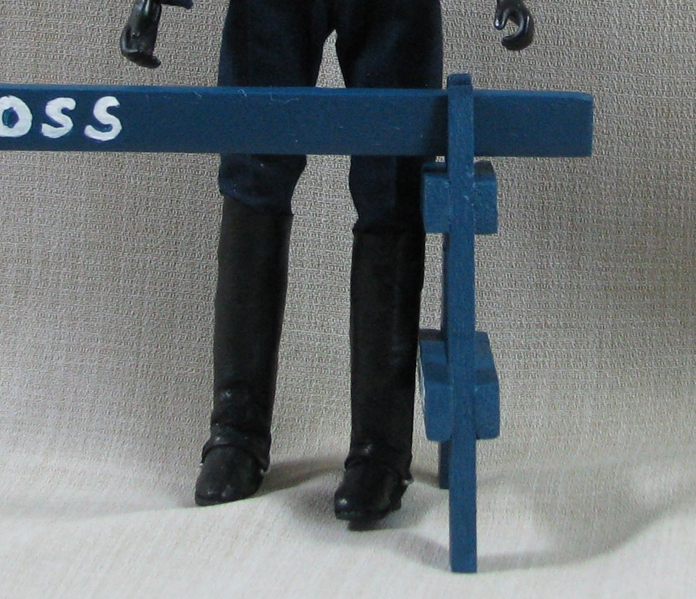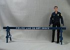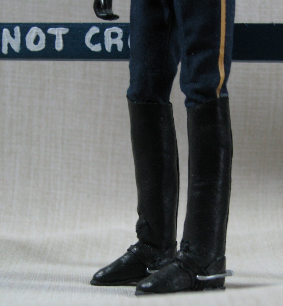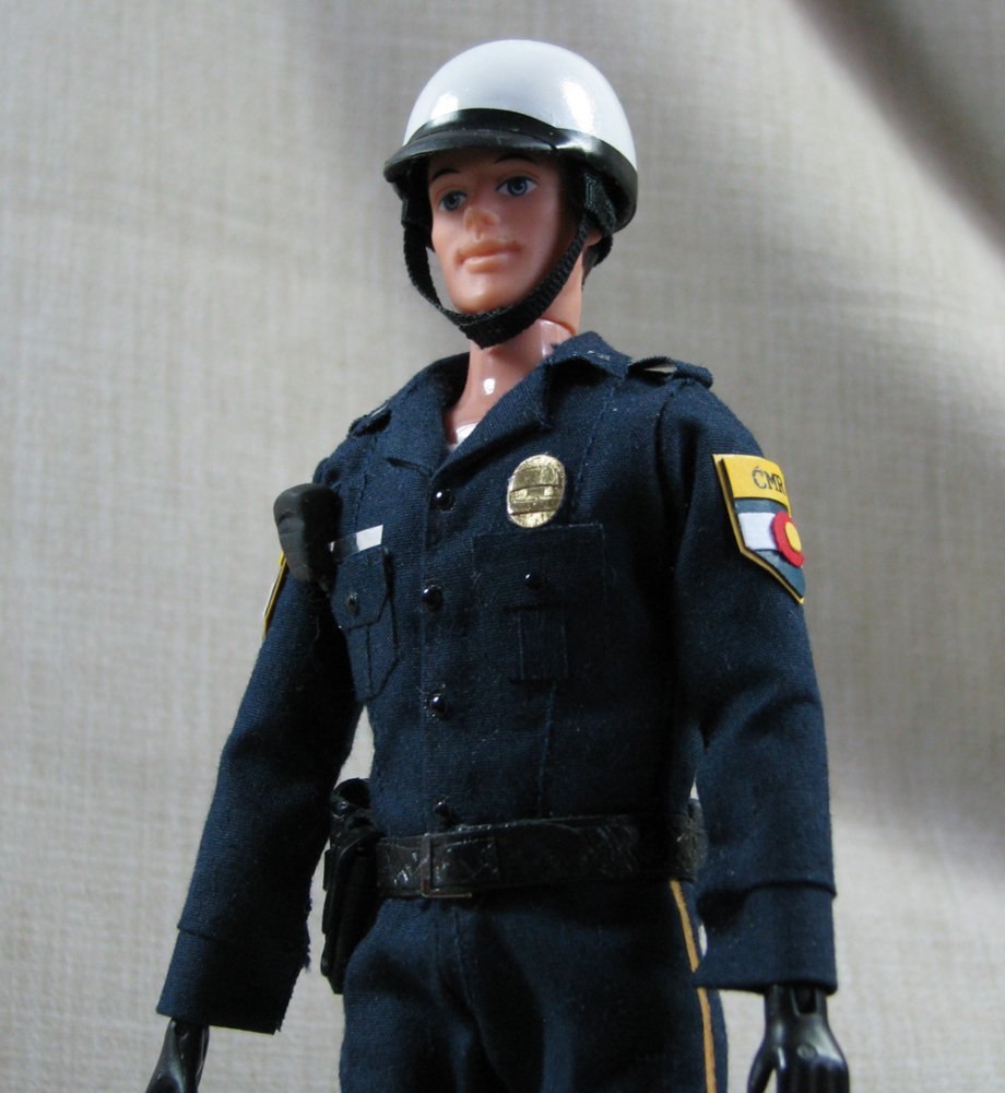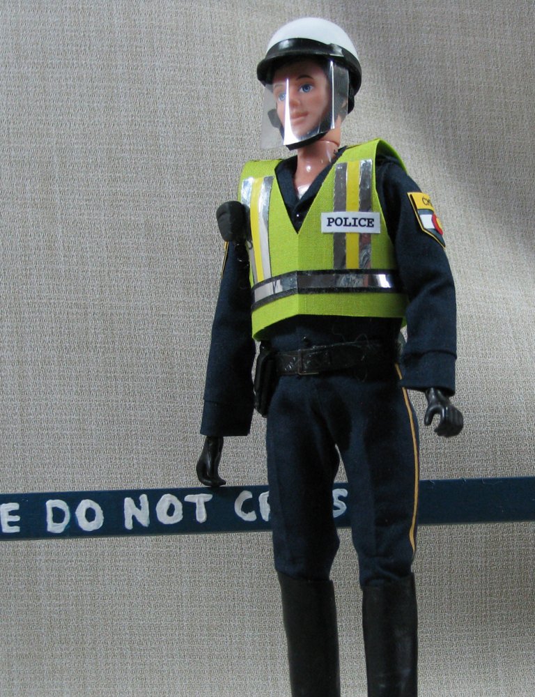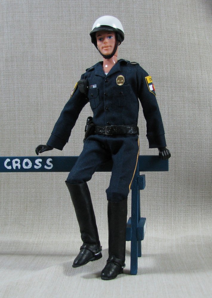 The doll in this auction lot is by Jane Schneider of Glyn Haven Studios. Jane has taken a Breyer doll and turned him into Officer Joe, a handsome mounted policeman. His seat and legs have been modified to fit nicely in the saddle. He is wearing a uniform of navy blue that is complete with badge and shoulder patches. He has his walkie and wears a leather belt with holster and removable sidearm, handcuffs, ammo clips and pepper spray. He has heavy field boots with spurs and a white riding helmet. In addition to his everyday patrol gear, Joe comes with extra gear for those hard-to-control crowds: a high visibility police vest, a second helmet with safety shield and knee protectors. Jane's books are closed, so this is your chance to get a doll that would not be available otherwise.