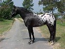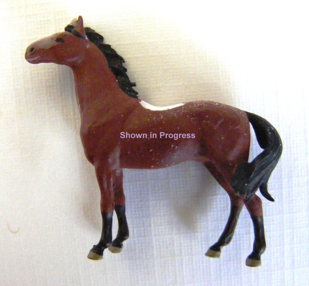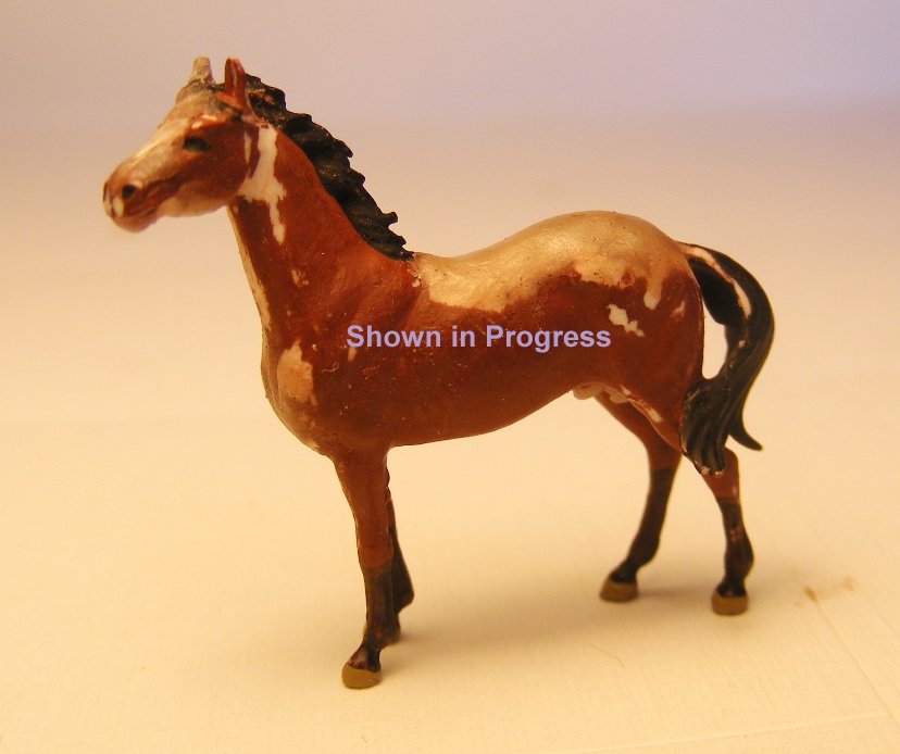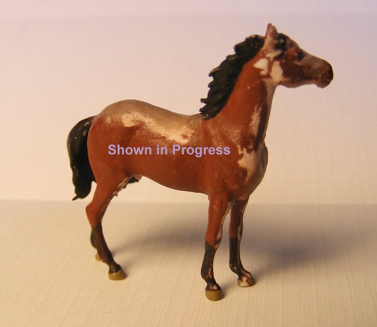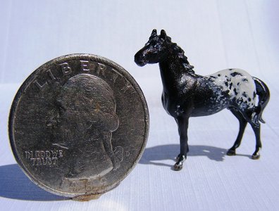 Using a teeny plastic micro model from an HO-Scale Train Accessory Set, my 2010 NAN Auction Donation is a likeness of "GS Name of the Game", a 97% foundation Appaloosa (shown below). Owned by Carol Olson of Pine Grove, California, 'Gambi' is a stunning example of the luxurious spotted blanket coat intrinsic to this breed.