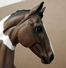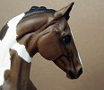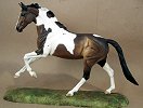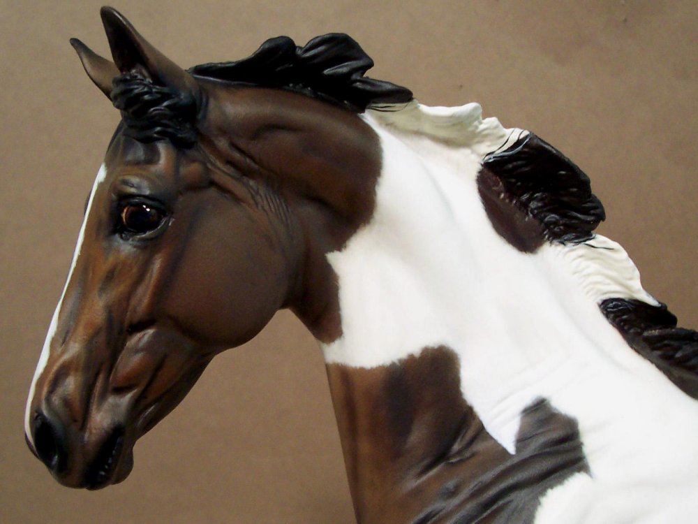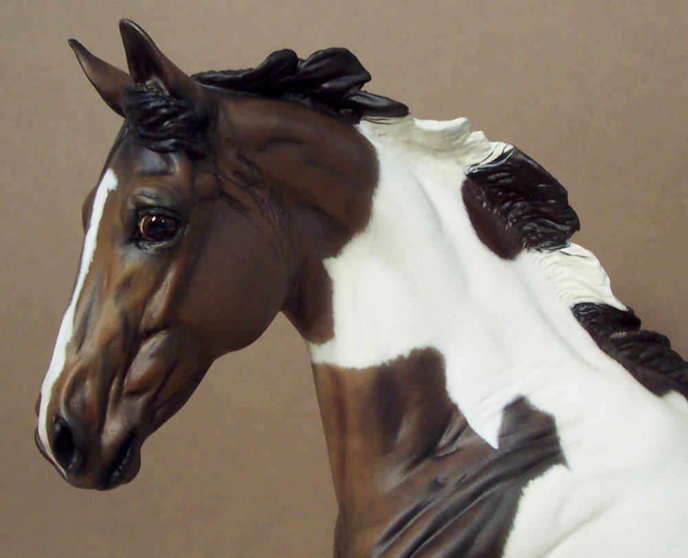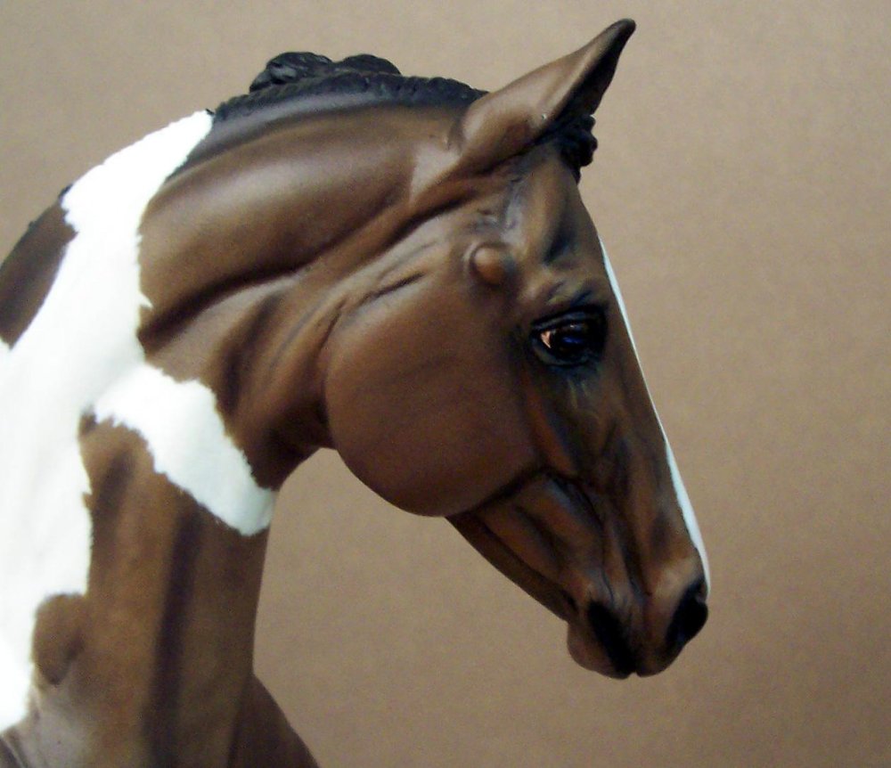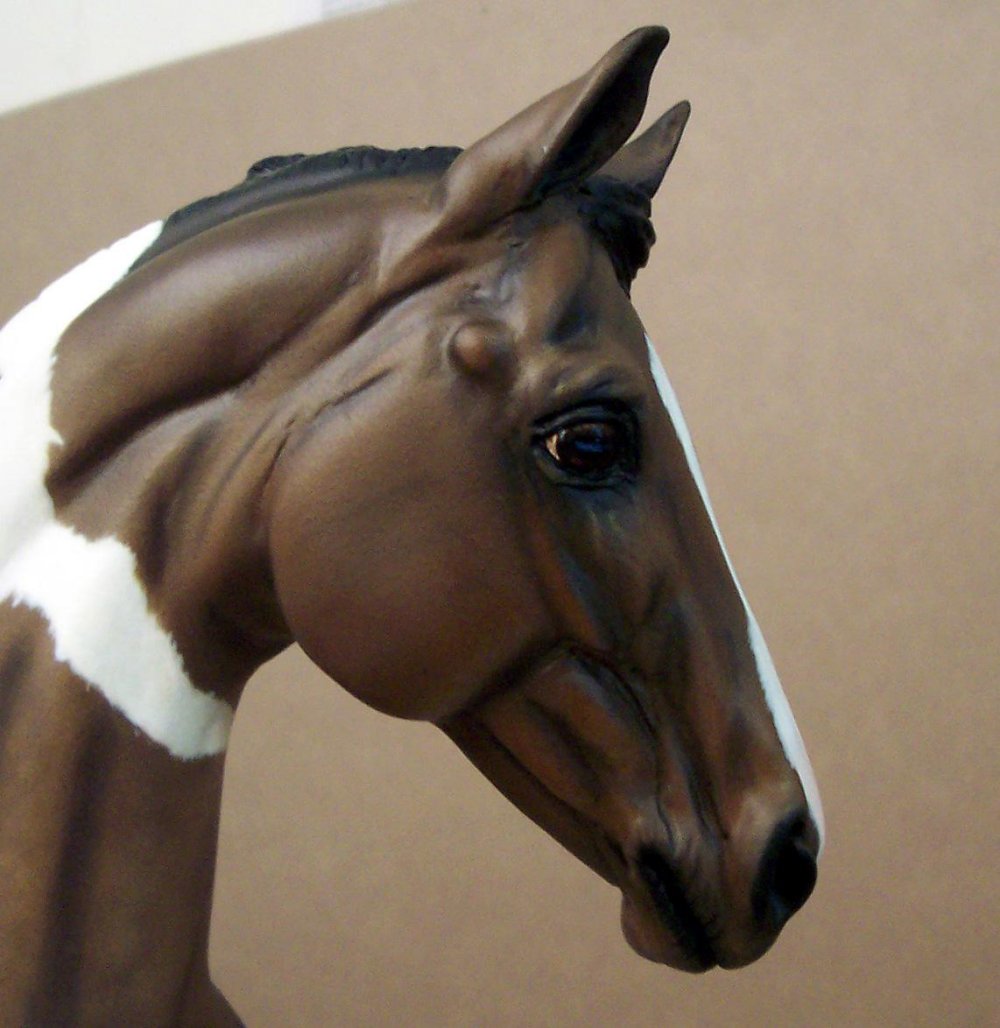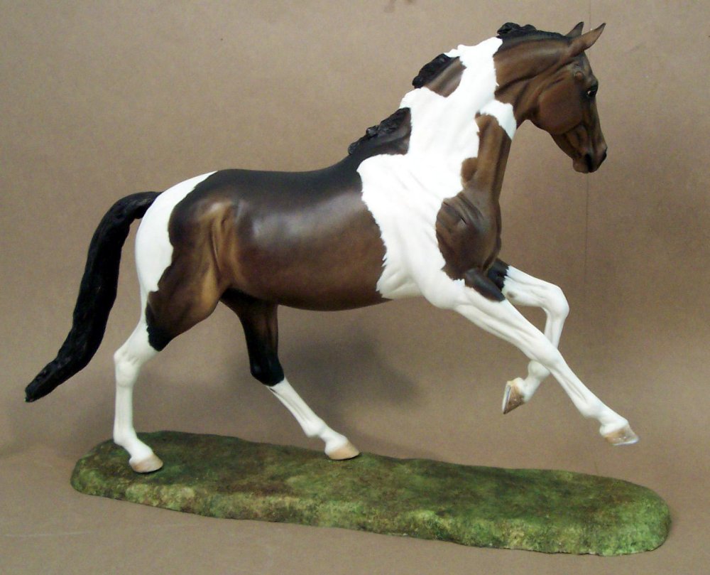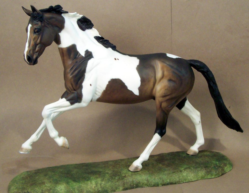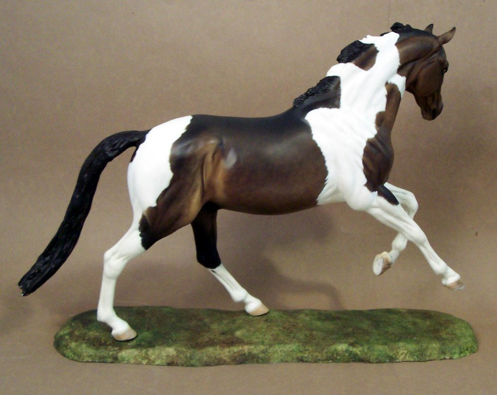 New large traditional Warmblood resin (Sir Shiwago) with changed mane and tail, painted bay tobiano by Jeannine de Cuir. Shown in progress, he will receive more detailing, and he will come with an additional sand/dirt colored base.