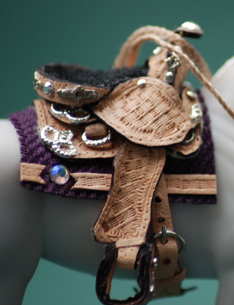 SM Western Show saddle set- fully tooled in basket weave (in light oil with black suede seat) with real metal silver embellishments, one ear headstall bridle with braided floss reins, added silver to bit, cheeks and ear and silver *buckles* with keepers. Saddle pad in Plum with tooled leather and conchos.