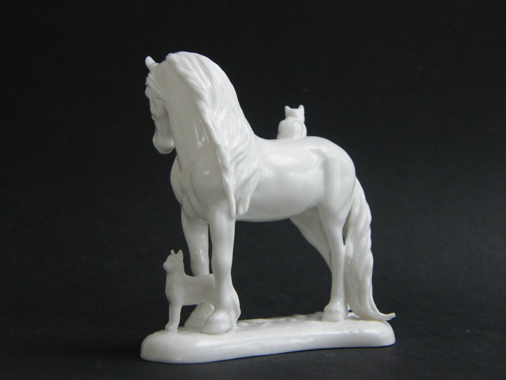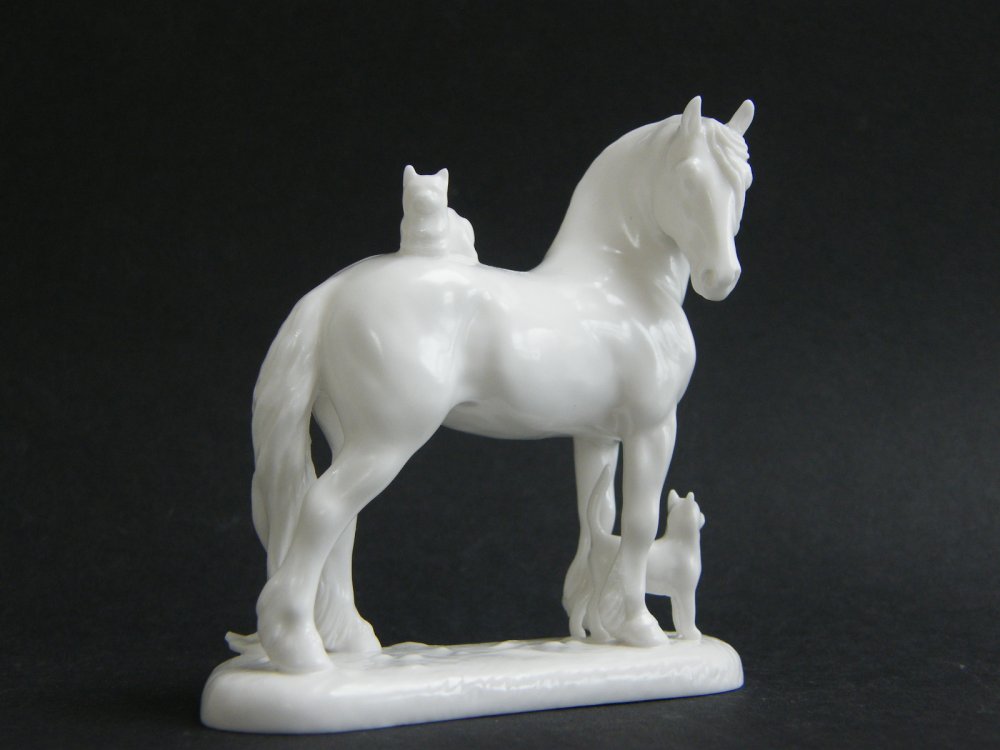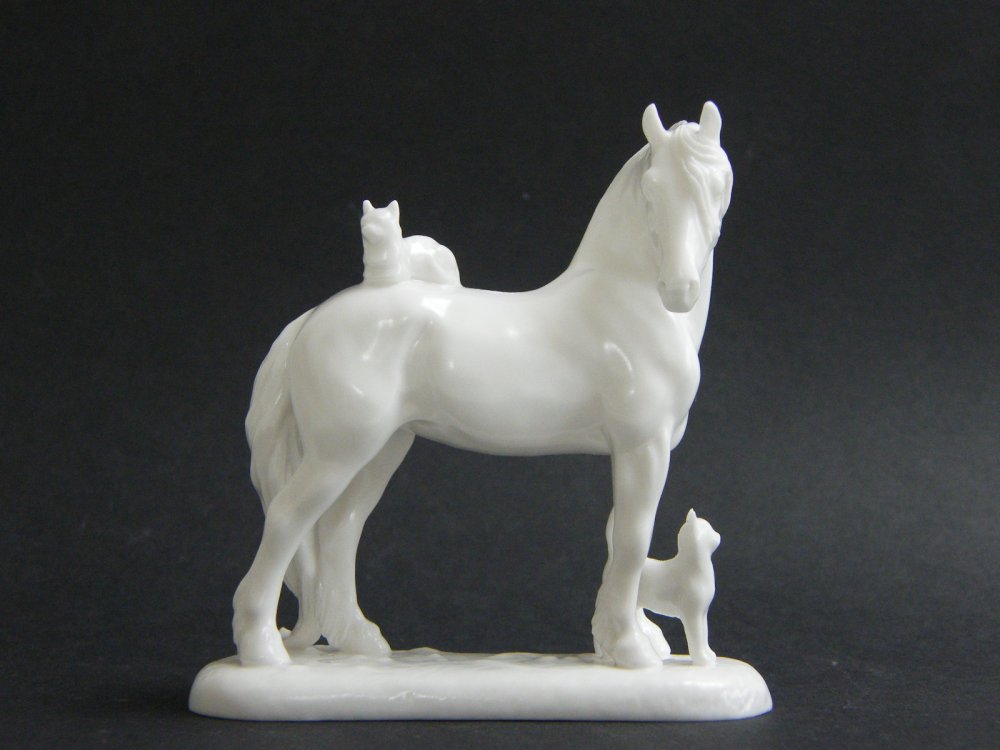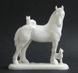 Donna is working on a Fine Bone China friesian mare/or Norman being prepared with a cat on her back and a cat rubbing at her front legs. ![]() | ||||||||