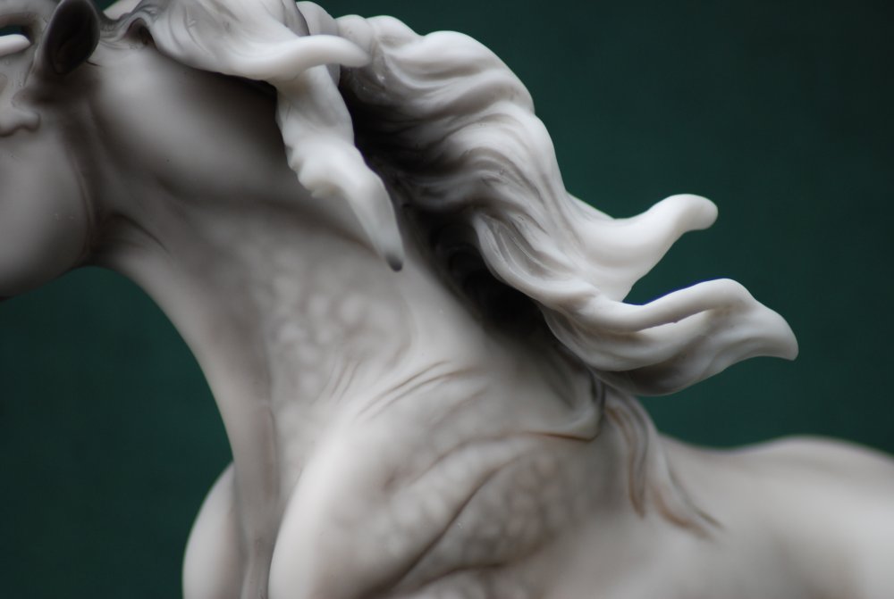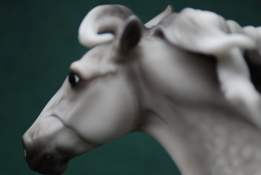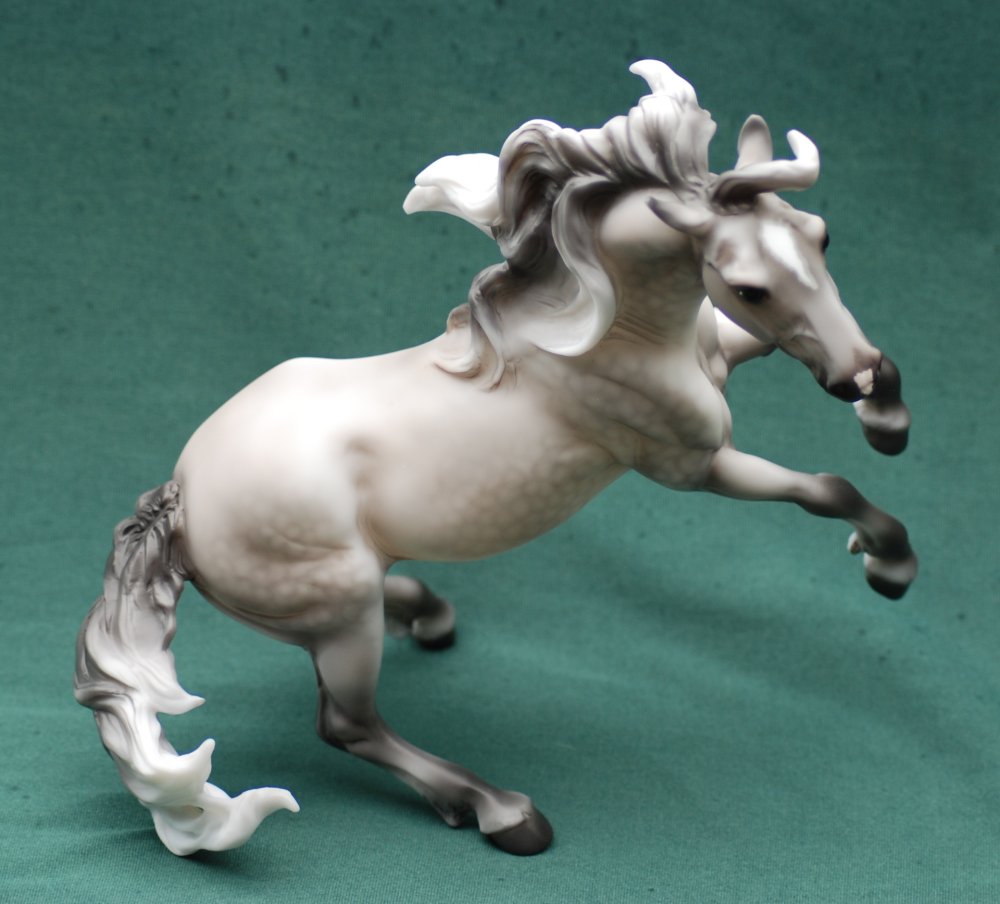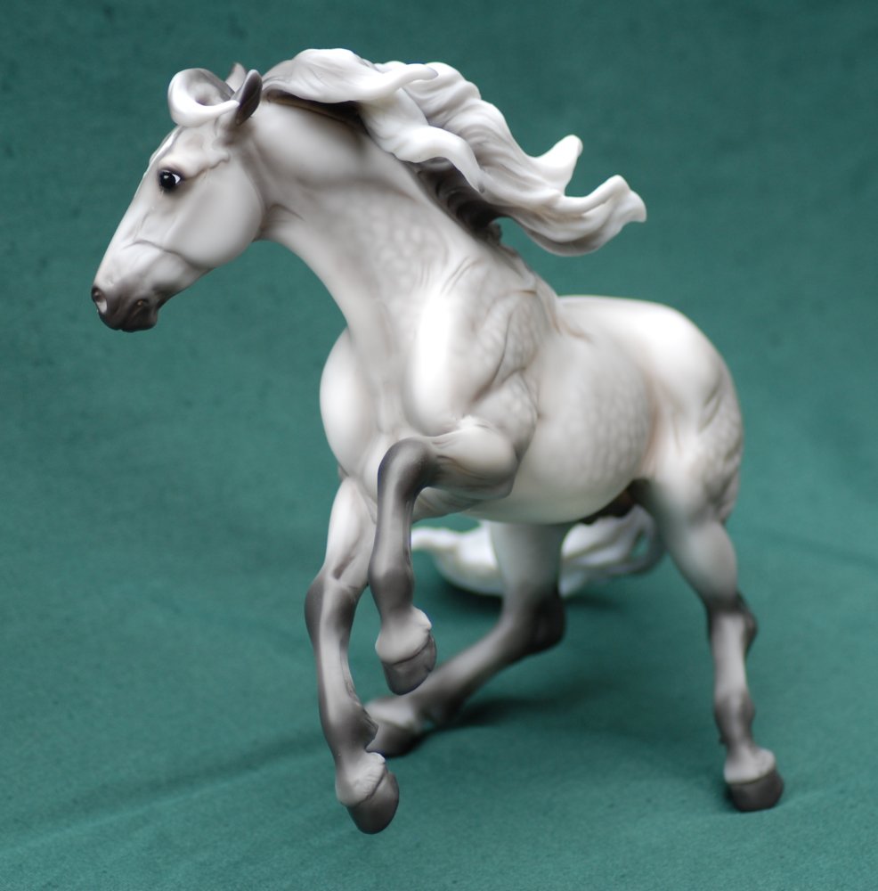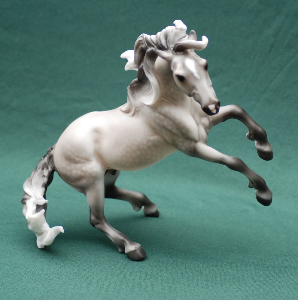 Krustallos is a genuine Breyer model, hand-decorated as a dapple grey on the Spanish Mustang mold #705 and features a snip and a star with mapping. Krustallos was hand-decorated at Breyer Animal Creations, a division of Reeves International, Inc in Wayne, New Jersey. Since Crystal is commonly associated with a 15th anniversary, the model is named after the Greek route word for crystal, krustallos, meaning "clear ice," in honor of the 15th anniversary of NAN.