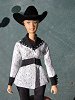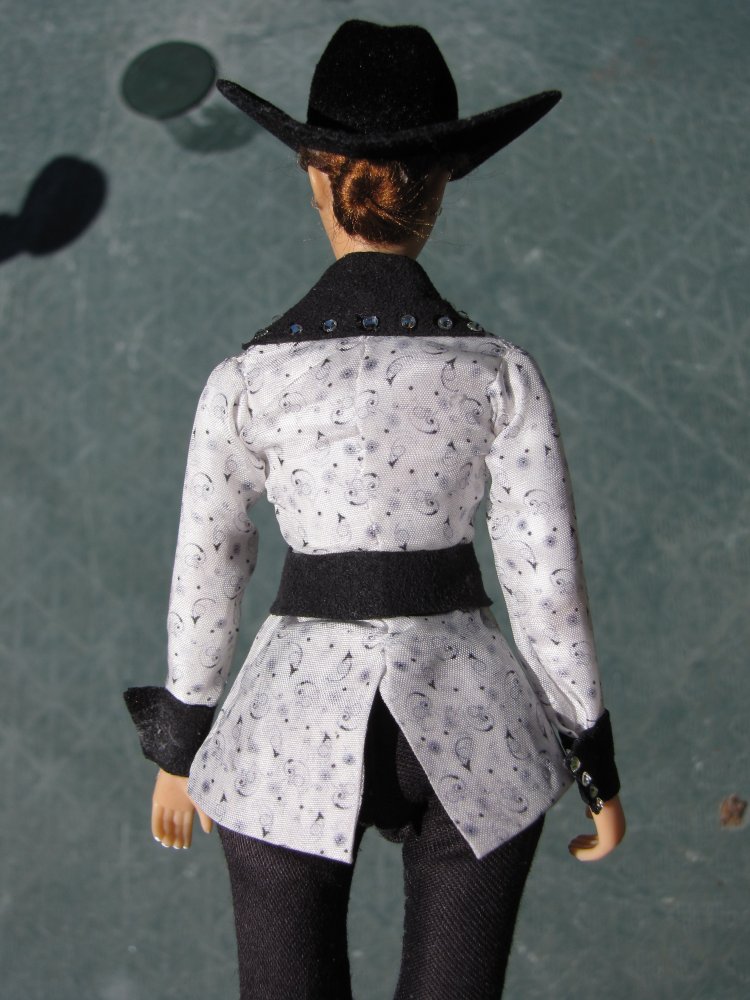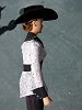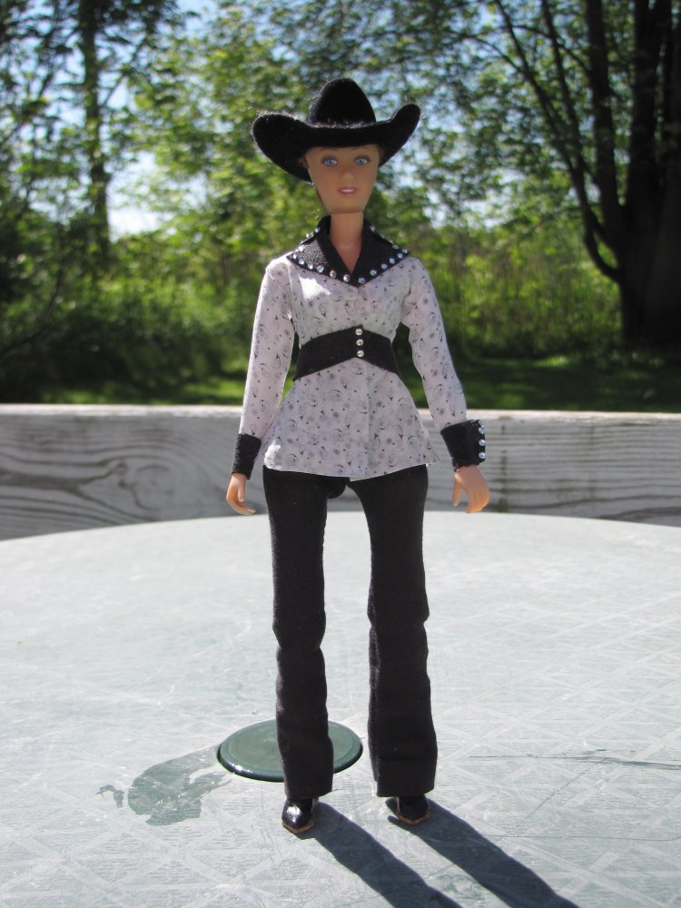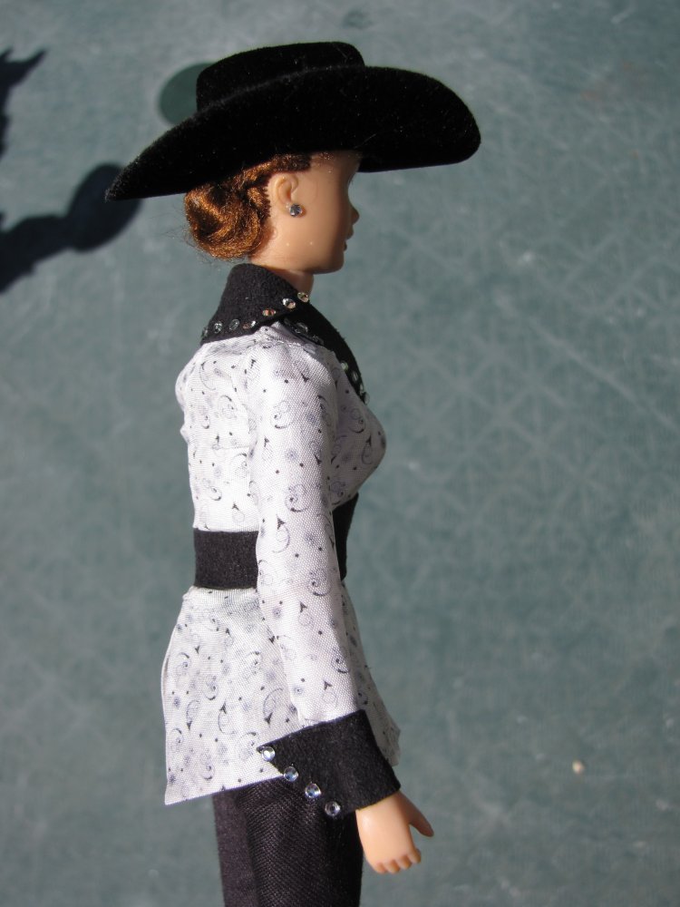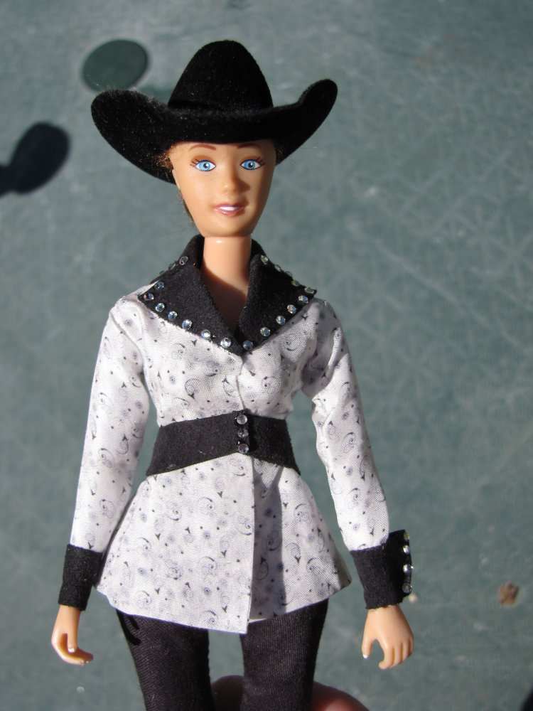 This is a lovely showmanship doll in a modern black and white outfit by Anne Field. This doll will match up well with any horse you put her with. Her printed tunic top has ultra suede detailing with just enough Swarovski crystals added to make it sparkle without being overwhelming. She has on black pants, black boots and a black hat. The doll has new, rooted medium brown hair pulled back in a bun. She also has a french manicure and crystal earrings to complete her look. This year show ring styles are more reserved than they have been in years past and this doll reflects the current trends. ![]() | |||||||||
