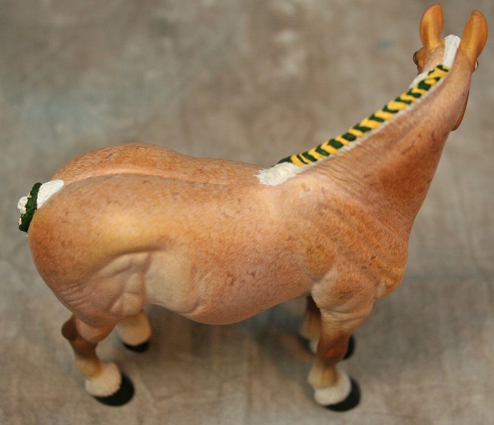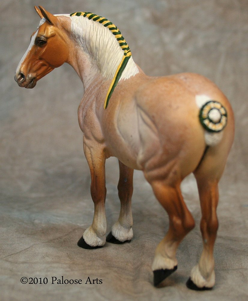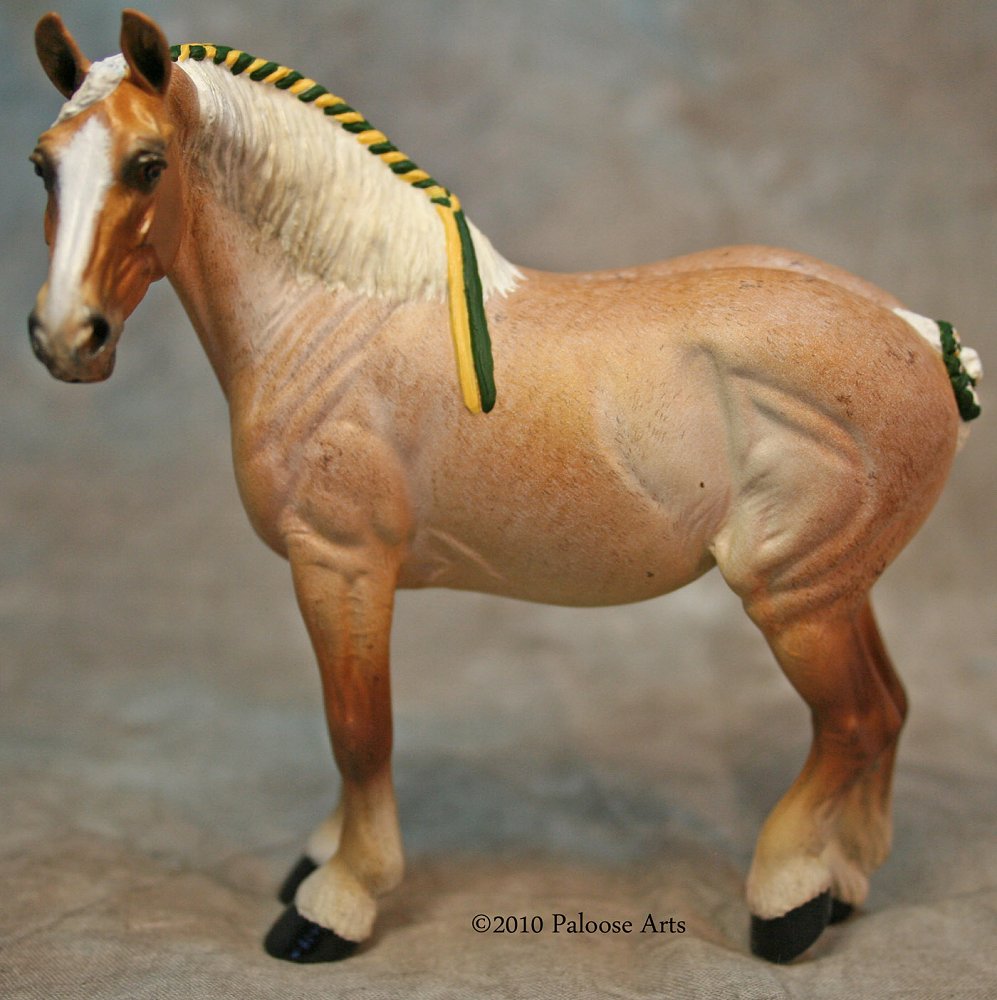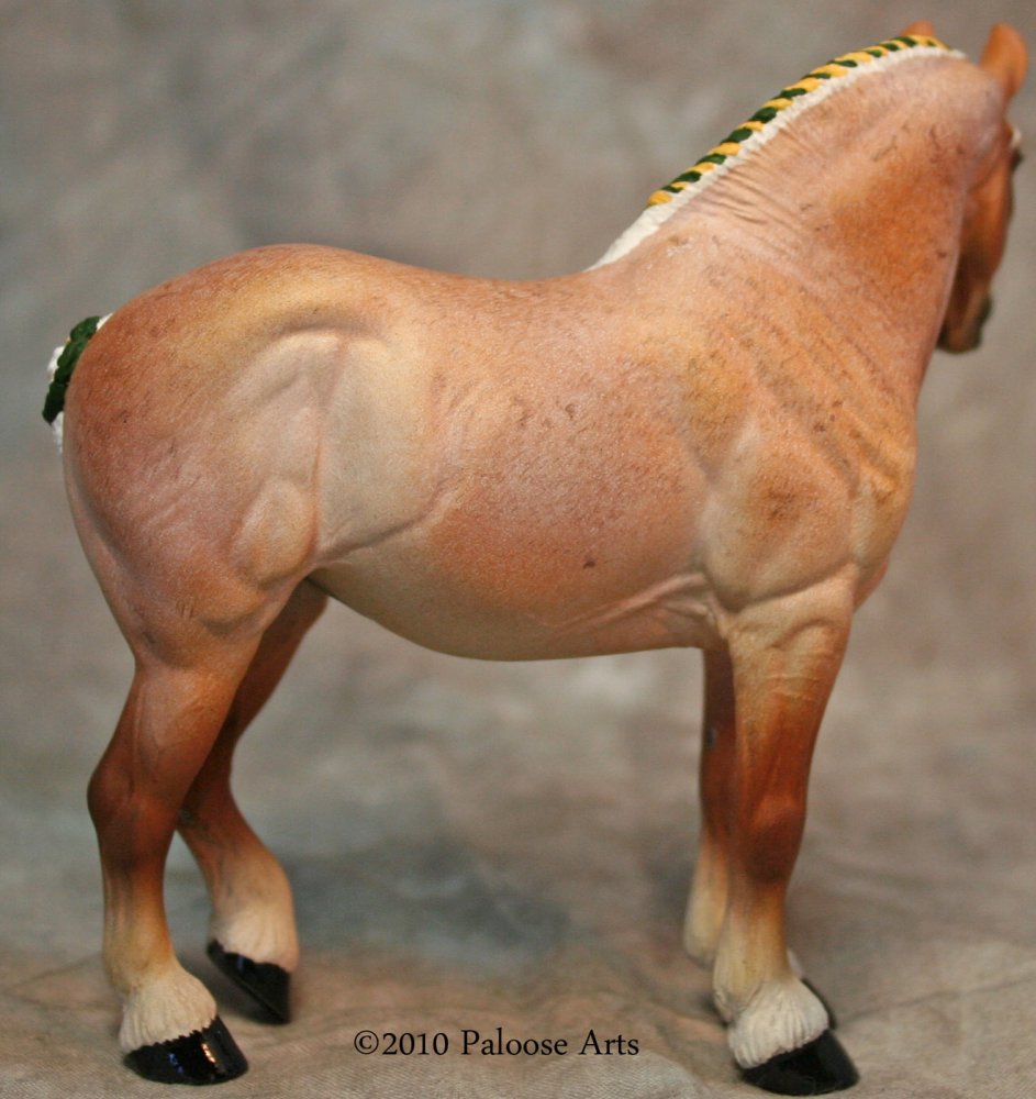 Honey B is a customized mini Scarlett to a show ready roan flaxen chestnut Belgian mare. She's a lovely chestnut roan with the typical Belgian light points, full blaze and I gave her pumpkin skin on the muzzle and udder. She's been give a custom mane, tail and forelock. Her mane has been placed even, all on one side with a ribboned mane roll in green and yellow. The tail is docked, braided and rolled with a matching fan ribbon. She has a couple final touches with a braided to the side forelock (these horses are shown with the forelock that way under the halter) and polished black hooves.