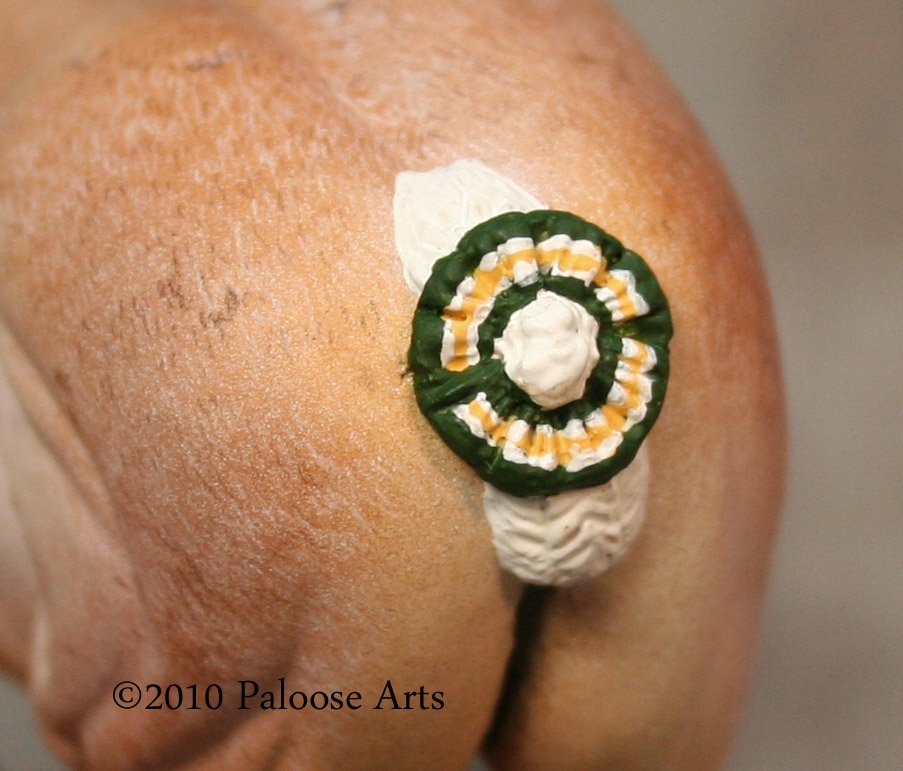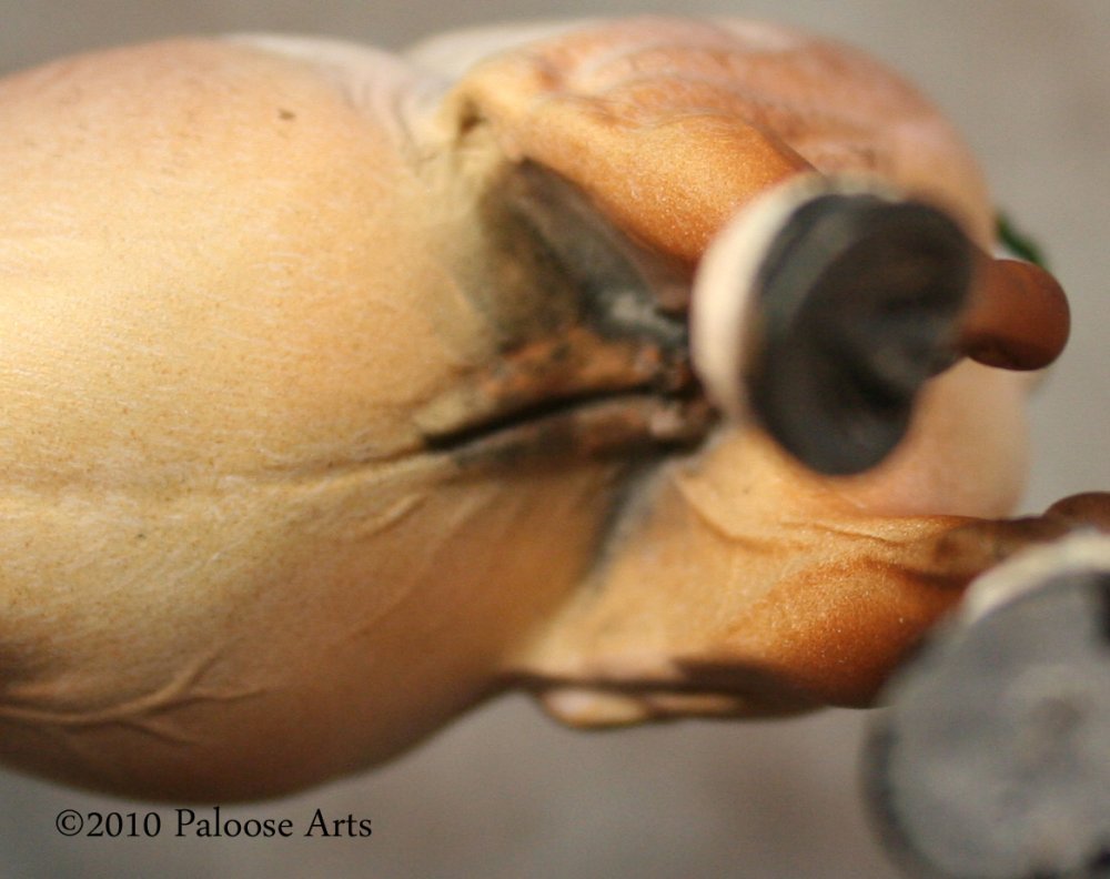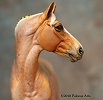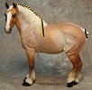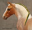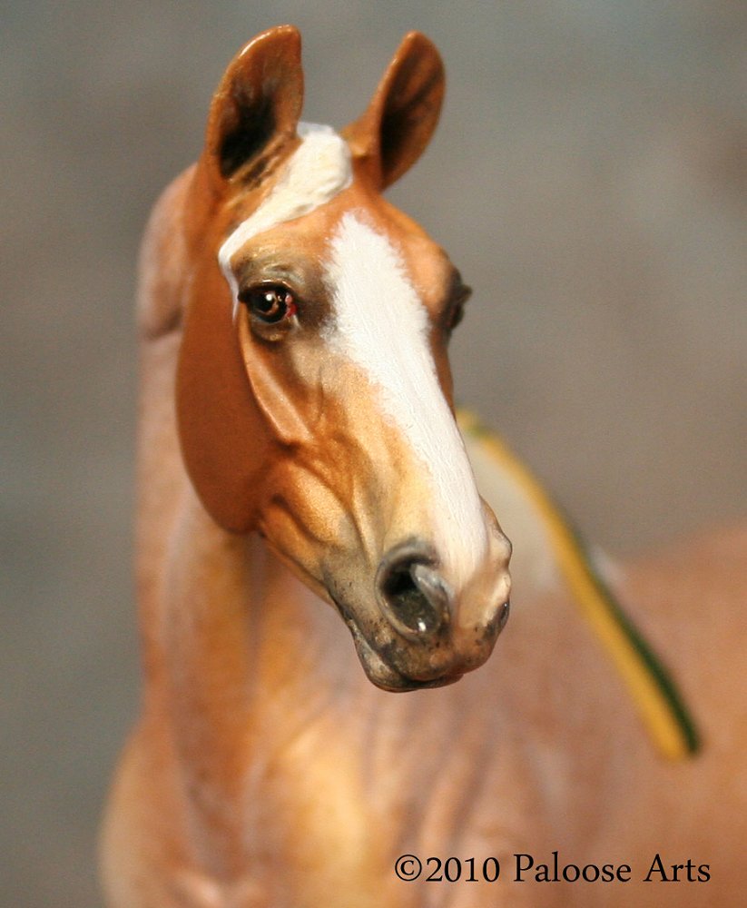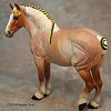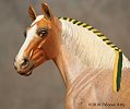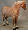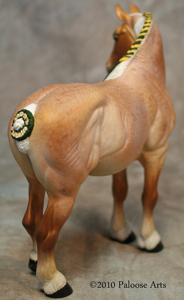 Honey B is a customized mini Scarlett to a show ready roan flaxen chestnut Belgian mare. She's a lovely chestnut roan with the typical Belgian light points, full blaze and I gave her pumpkin skin on the muzzle and udder. She's been give a custom mane, tail and forelock. Her mane has been placed even, all on one side with a ribboned mane roll in green and yellow. The tail is docked, braided and rolled with a matching fan ribbon. She has a couple final touches with a braided to the side forelock (these horses are shown with the forelock that way under the halter) and polished black hooves.