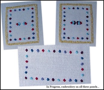 The is a one of a kind Arabian native-style costume by Melissa Nei of Adiva Arabians in traditional scale. The drape/saddle piece is hand embroidered over white material with plum, cranberry, forget-me-knot purple, sky blue and maritime blue, and sparkling with silver and gold. The saddle seat is hand molded and covered with a cranberry material that has a crushed velvet feel to it, the top edges of the seat are lined in more hand embroidered swirls to compliment the drape and give it that extra touch of authenticity. The stirrups are english in style and placed beneath the saddle as is traditional for the true native style costumes, and are adjustable. The girth is made of elastic and fastens through the shoopand which is attached to the bottom of the collar, and then comes up to finally attach on the otherside of the drape, this piece is also adjustable. The drape is lined in a double tier of silky tassles in alternating tassles to match the drape, and also a little gold fringe for some extra added flair! Finally a pair of drop ropes hang from the back of either side of the saddle with a set of tassles adorning the ends.