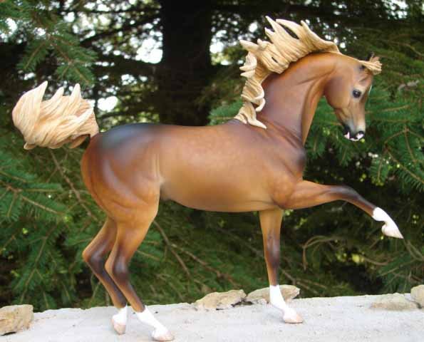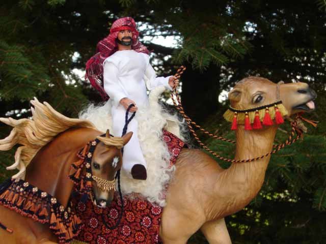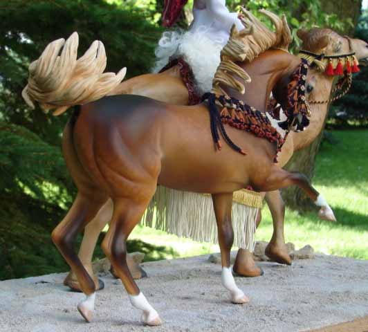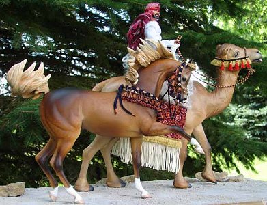 Years ago I had to pleasure of meeting Lisa and getting to know her love of Arabians and their costumes, especially the dancing horses. I wanted to do something I knew she would like....as a tribute to this great artist that was sadly lost to cancer last year. This set includes a drastically customize breyer lonesome glory, with a presentation halter and breastcollar made by Lisa before she passed. This dancing stallion boldly prances alongside a full size camel, a very limited resin copy of my original PAM remake "Imafam". The camel is fully dressed with camel saddle, decorative drape, and camel rider! No detail is spared, and the camel resin will NOT be available for public sale, this will be the only copy sold to the public. Please follow along on http://purdyhorsefarm.blogspot.com.