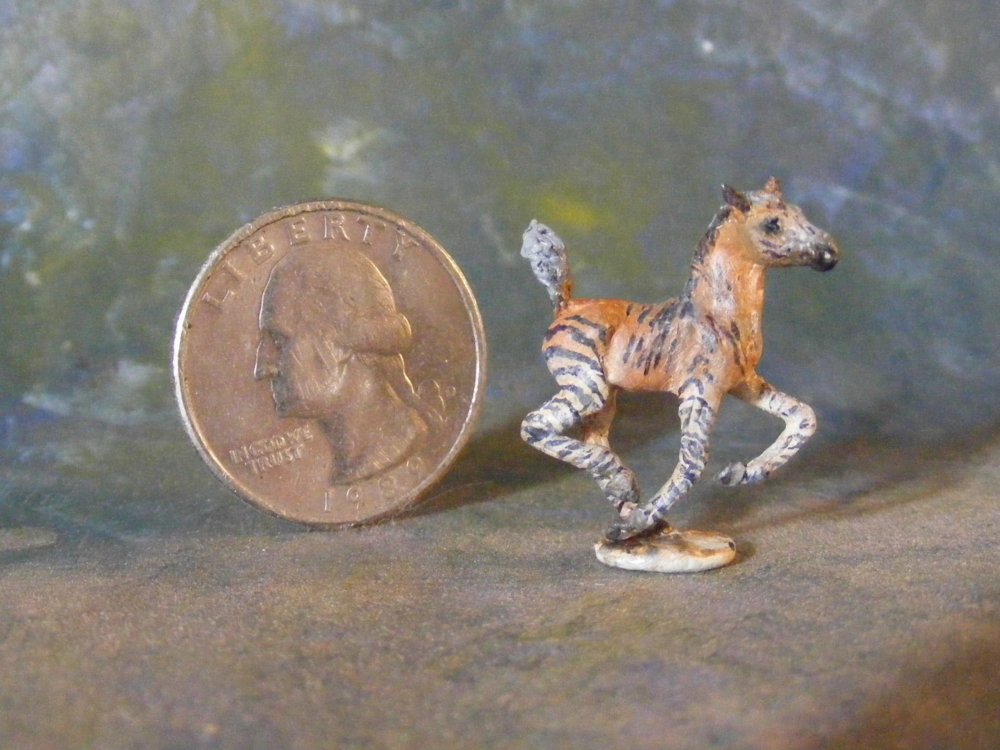 Chris brings yet another of her mini wonders! This particular Maggie Bennett micro mini pewter foal has been filled in, then prepped to take on the striped body of a Zorse foal. Documentation and matching photograph will accompany the custom. Photo courtesy of Chris Jones | ||
