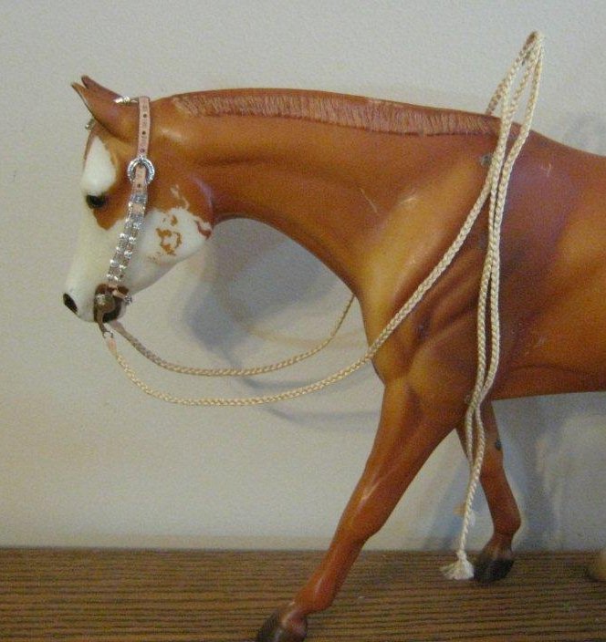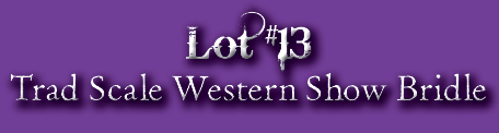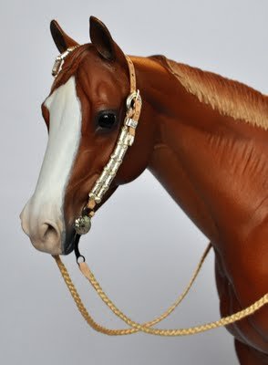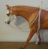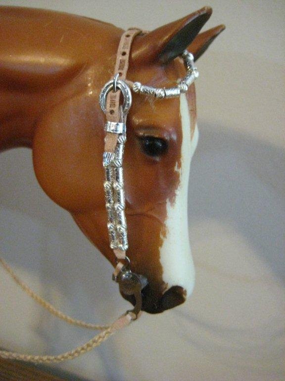 ![]() This is a top LSQ traditional scale one ear western show bridle with silver ferrules by Carrie Sloan Meyer. It includes an etched Rio Rondo curb with added conchos, curb chain, braided floss reins, custom working buckles and light oiled leather accents. The cheek pieces and ear piece have two different kinds of silver ferrule beads. The bridle is currently set to fit on the Zippo Pine Bar, however it will adjust to fit other similar sized model horse heads. | |