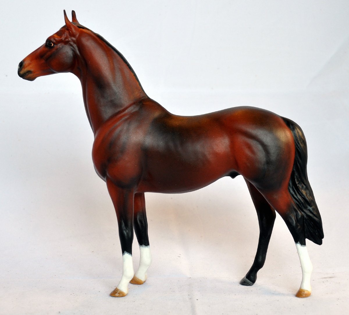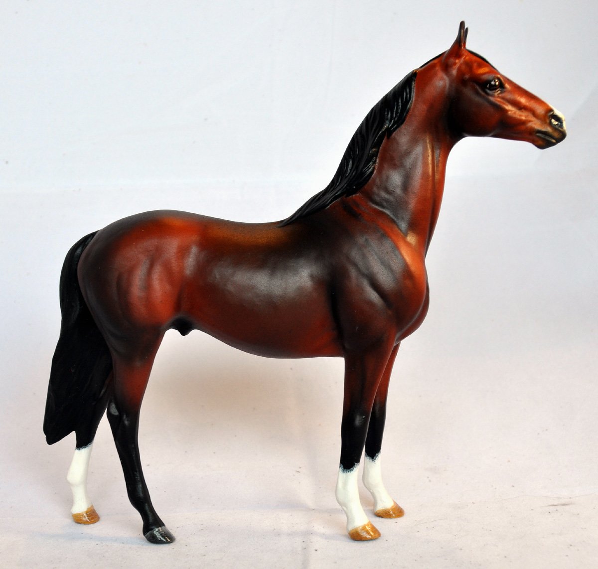 This lovely classic Man O War was painted and donated by long time Thoroughbred lover Kirsten Wellman. He's been turned into an elegant lightly dappled bay with white markings. He'll be an excellent addition to anyone's show string and perfect for the simple custom division. Photos courtesy of Jennifer Buxton | ||||