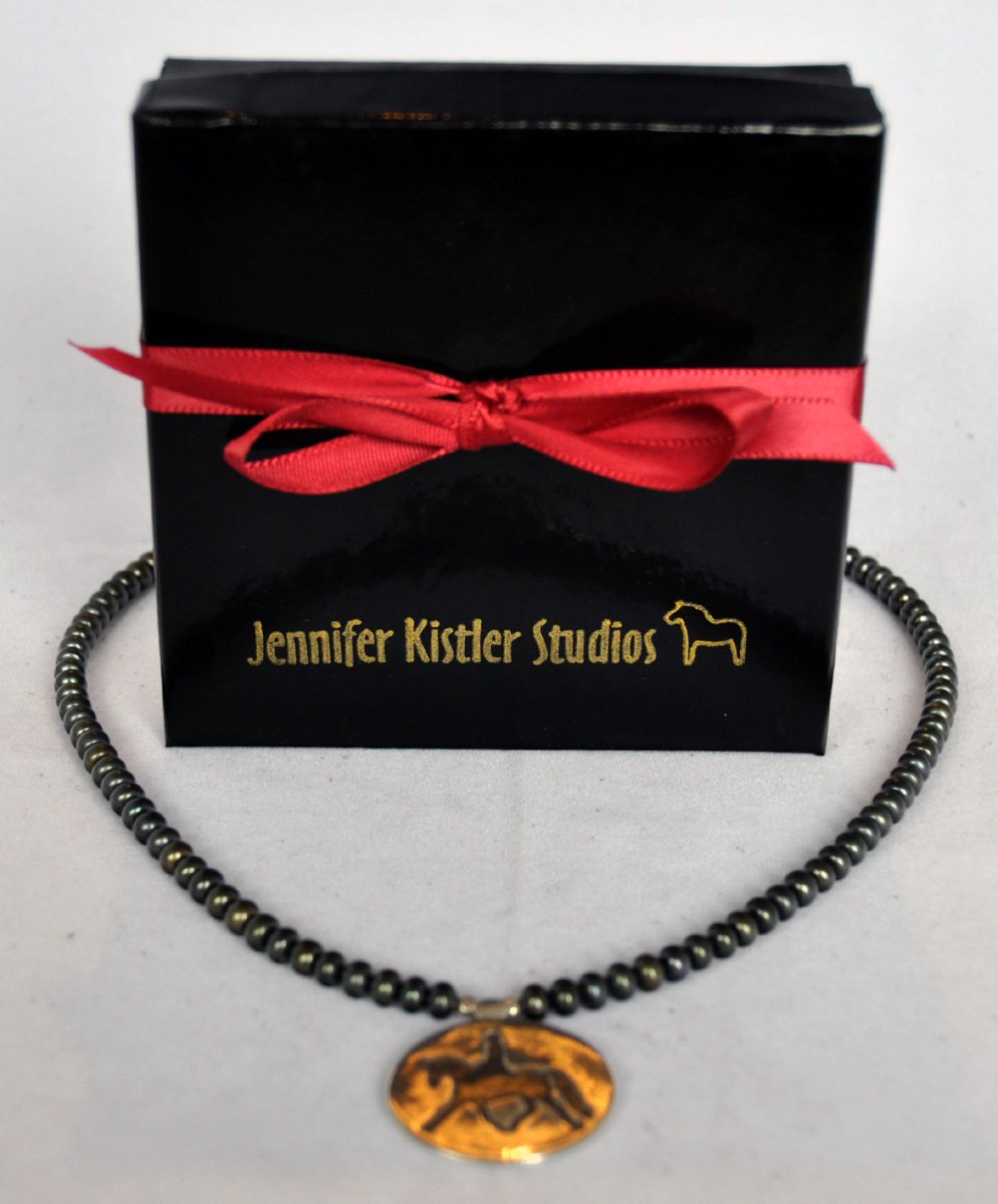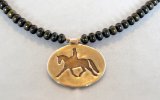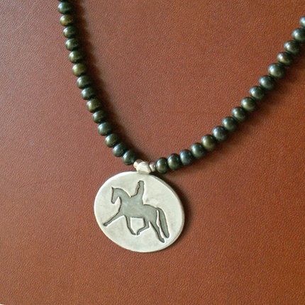 ![]() Donated by Jennifer Kistler, this pearl necklace features a dressage horse and rider performing a wonderful example of the extended trot. Smooth, lustrous pearls are a deep muted green with a bronze undertone, color varies some for a nice rich effect. The pendant is hand-polished and is more shiny than may appear in photos. It can easily go from casual to dressy. This classy piece is perfect for the dressage enthusiast or anyone who appreciates harmony between horse and rider (or who just loves equestrian accessories!). | |