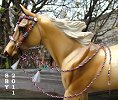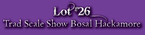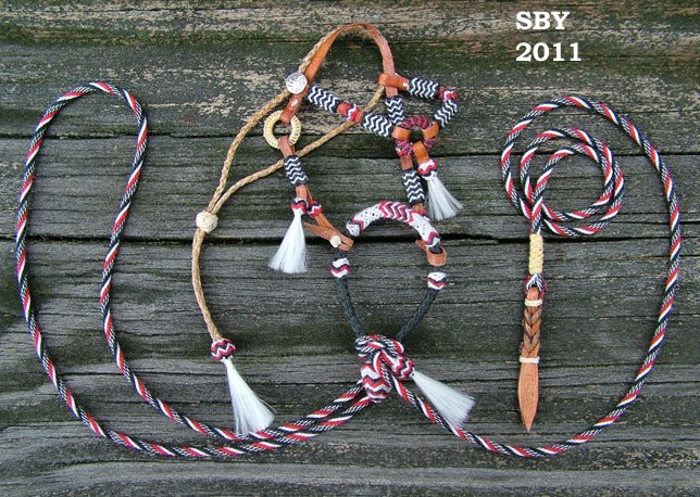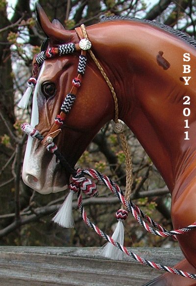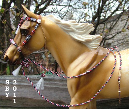 From long time donor Susan Bensema Young comes this stunning large traditional scale red, black and white show bosal hackamore. The 5-part mecate is made from handtwisted thread and has a tooled leather popper. The tricolor bosal, attached with button-and-slit, has a silver heel cap and interweave braiding on the nose, sides and heel. The ring-style adjustable leather headstall has 4B, 13P and 4B 5P braided buttons and two tassels. The braided sinew slip-fashion throatlatch has a large tassle of white "horsehair" and a slider covered with rawhide braid. This piece fits the Stone Palouse, Thoroughbred and Walker as well as Breyer's Roxy and other models of similar size. (It does not fit the Cleveland Bay.) | ||||