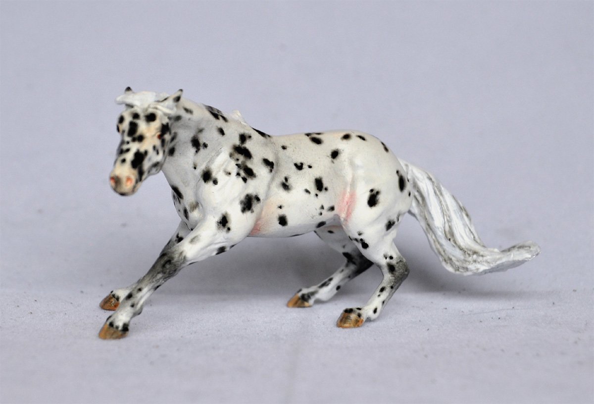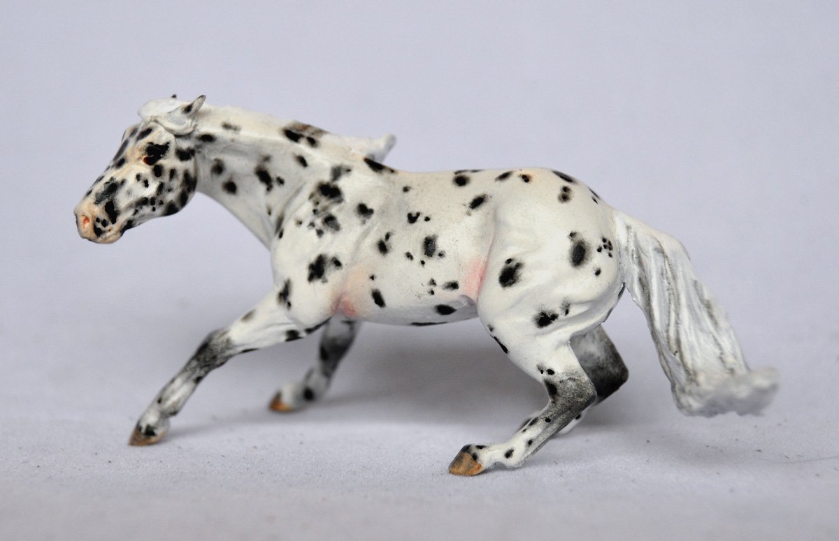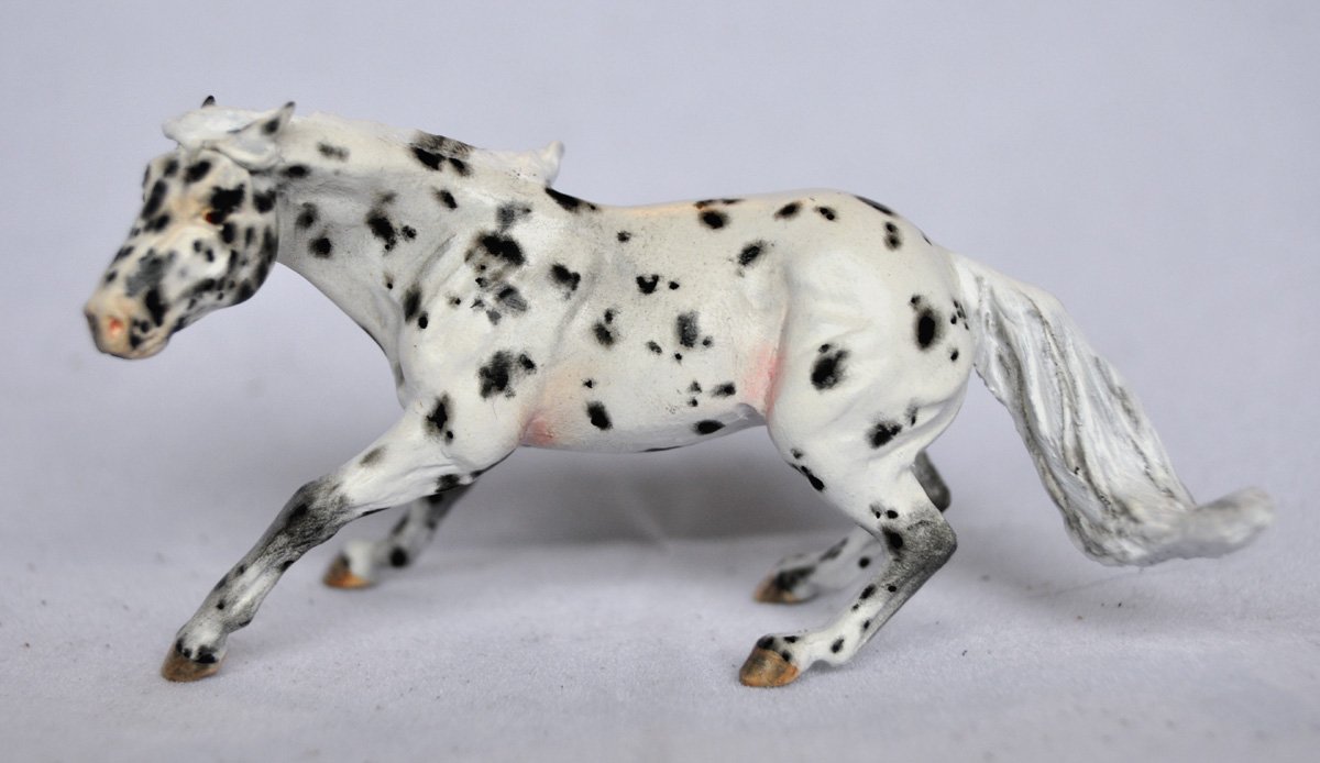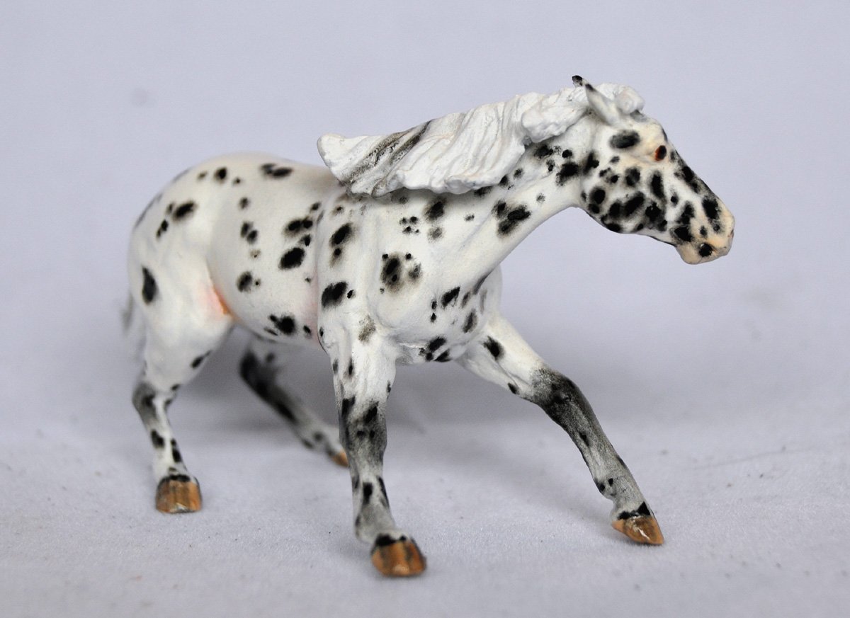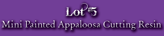 Jeanne Grunert of EquinArt Creations has kindly donated a LSQ example of her SM scale stock type cutting horse mare. This lovely piece was sculpted by Maggie Bennett exclusively for EquinArt Creations and painted by Lisa Bickford into a LSQ black leopard patterned Appaloosa. This piece is solid cast by MVS, an open edition and is 2.75". (Unpainted pieces are available at http://www.equinartcreations.com/QuarterHorses.html)