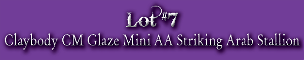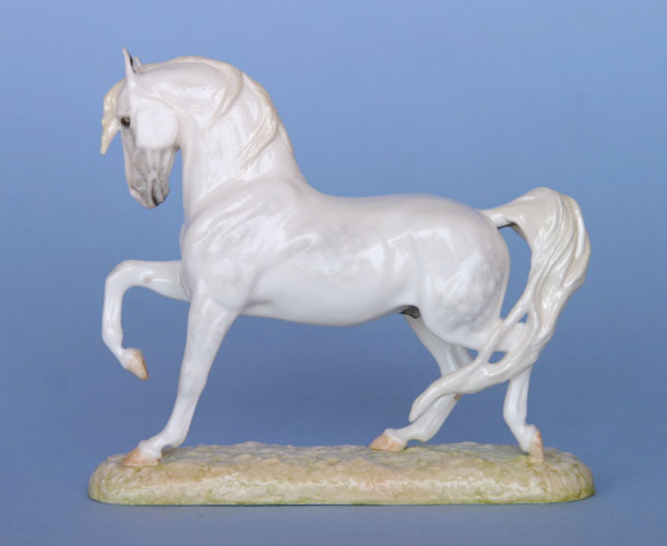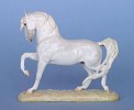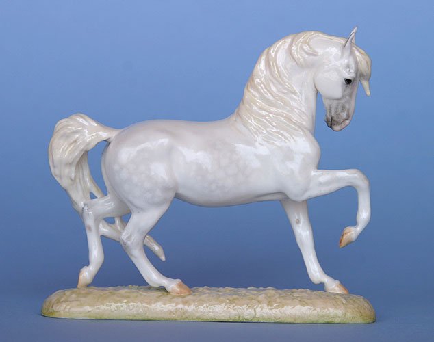Bone china striking Arabian stallion sculpted by Donna Chaney with claybody custom work by Paige Easley Patty including straighter face profile and customized mane and tail. The claybody bisque has been custom glazed by Marilyn Jensen to a white grey with creamy mane and tail, subtle dappling, and blaze. Satin finish. Media used: airbrushed underglazes, glaze, and hand painted overglazes, all kiln fired. Horse is 4 inches long x 3.5 inches high, including base. Photos courtesy of Marilyn Jensen | |||